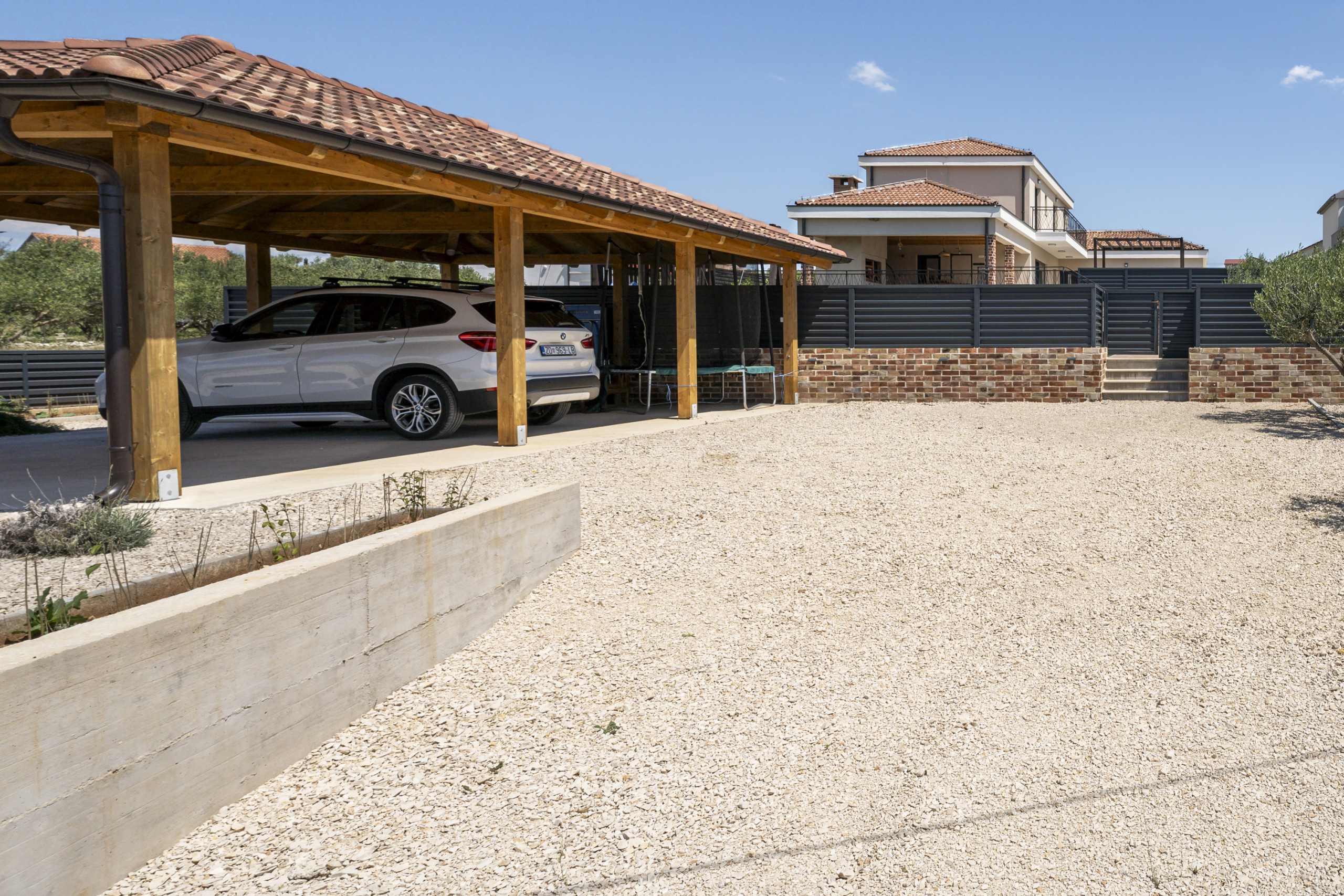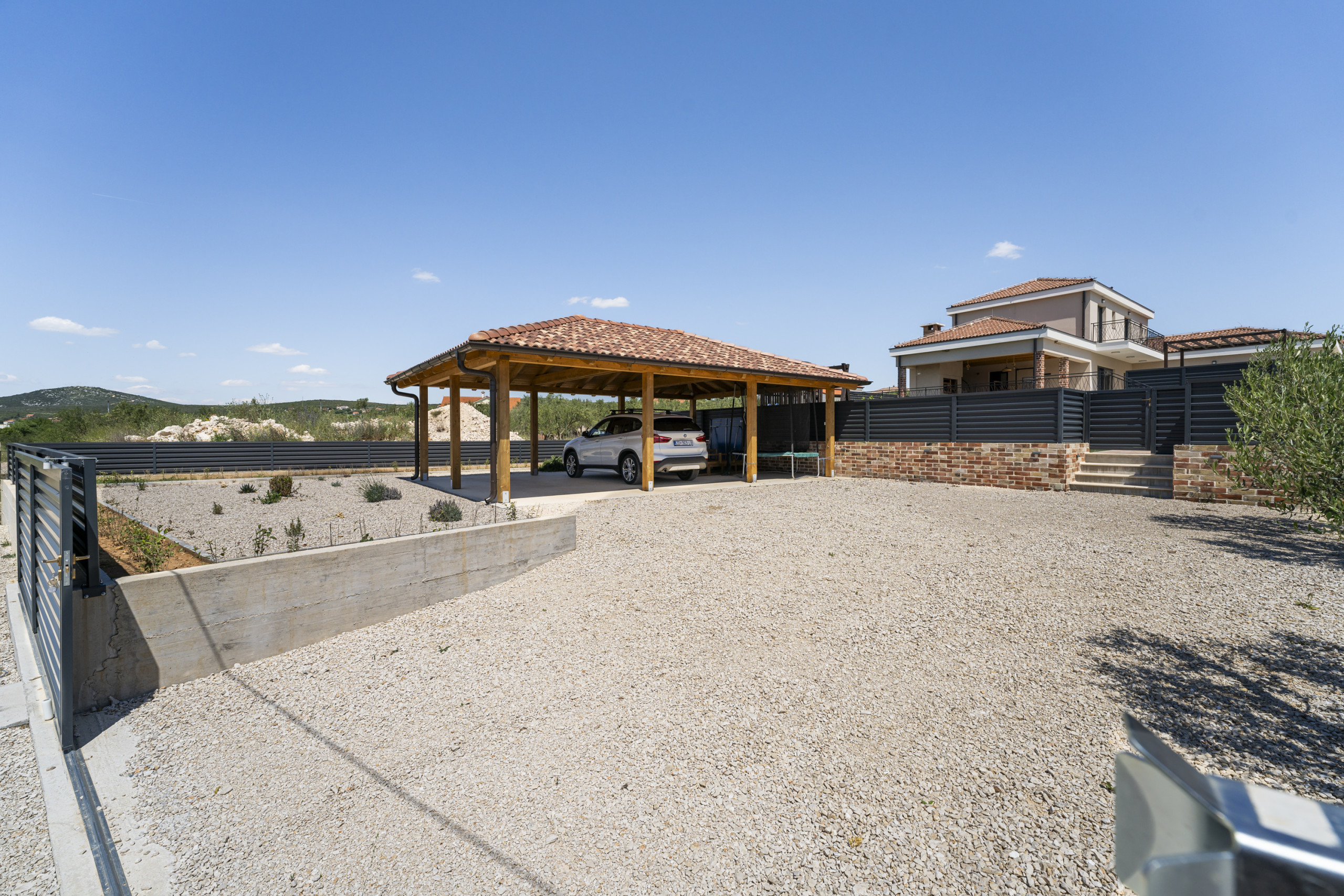 Villa Lara is fully fenced, ensuring complete privacy for guests. There are six parking spaces available (three within the courtyard and three outside).