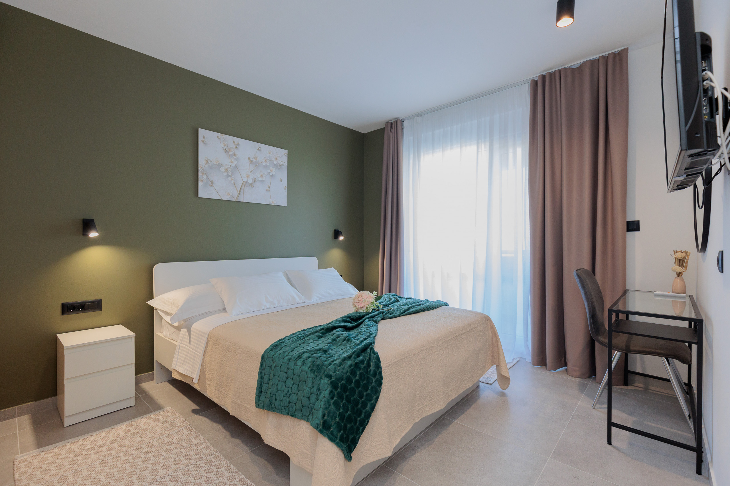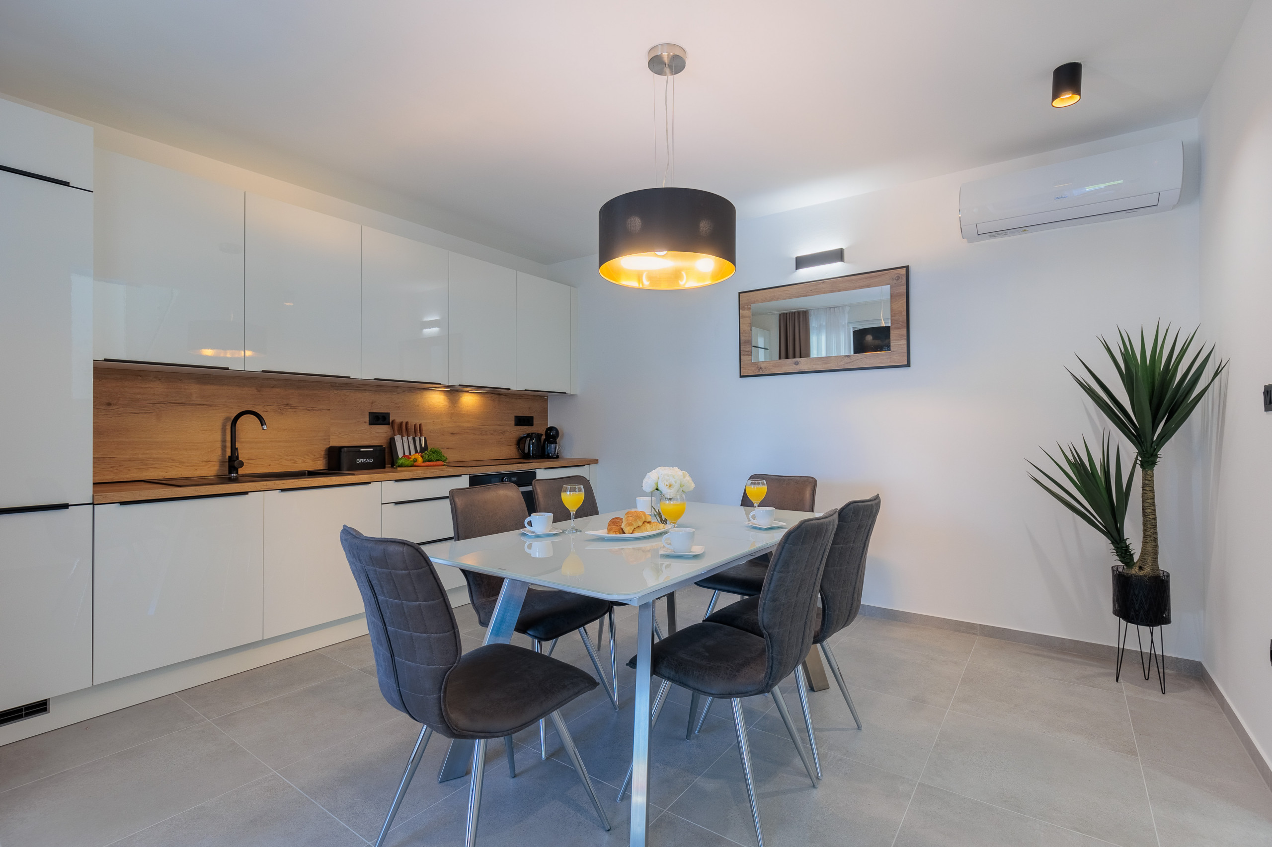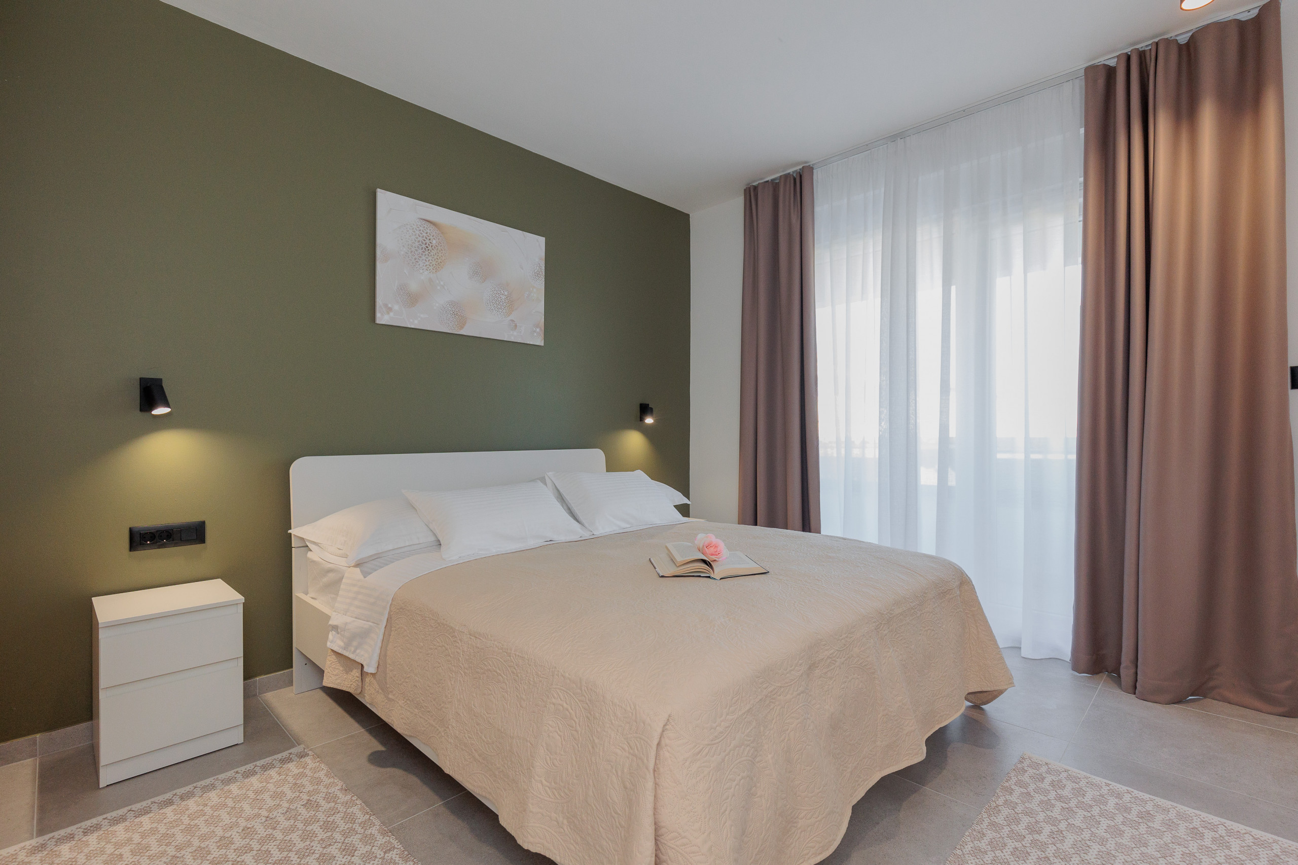 The comfortable living room is bathed in daylight and complemented by tasteful furniture. Fully equipped modern kitchen with high-end appliances that will satisfy even the most demanding cooks. The interior is thoughtfully decorated with interesting details and colors that blend harmoniously to create a visually stunning aesthetic.