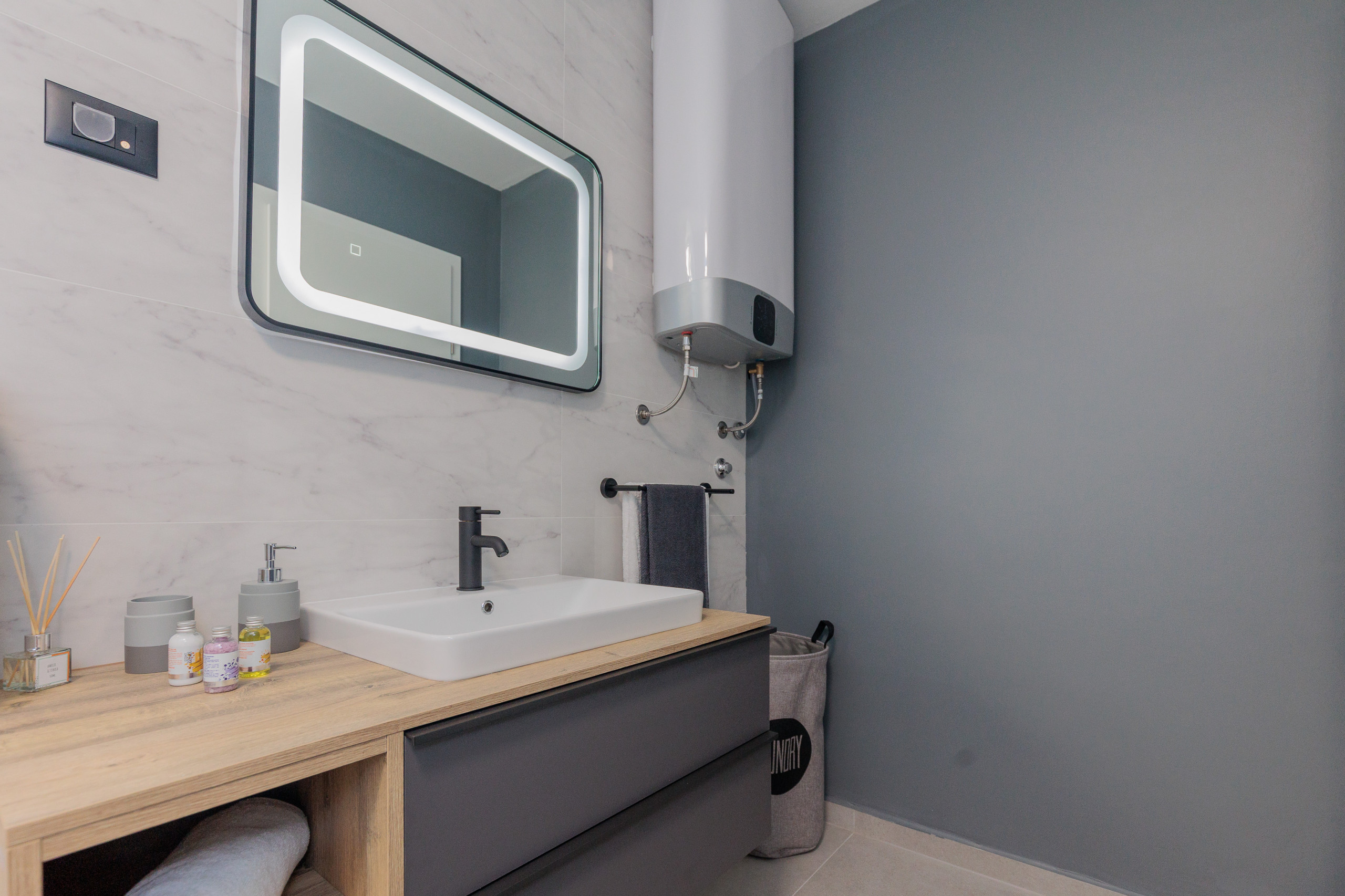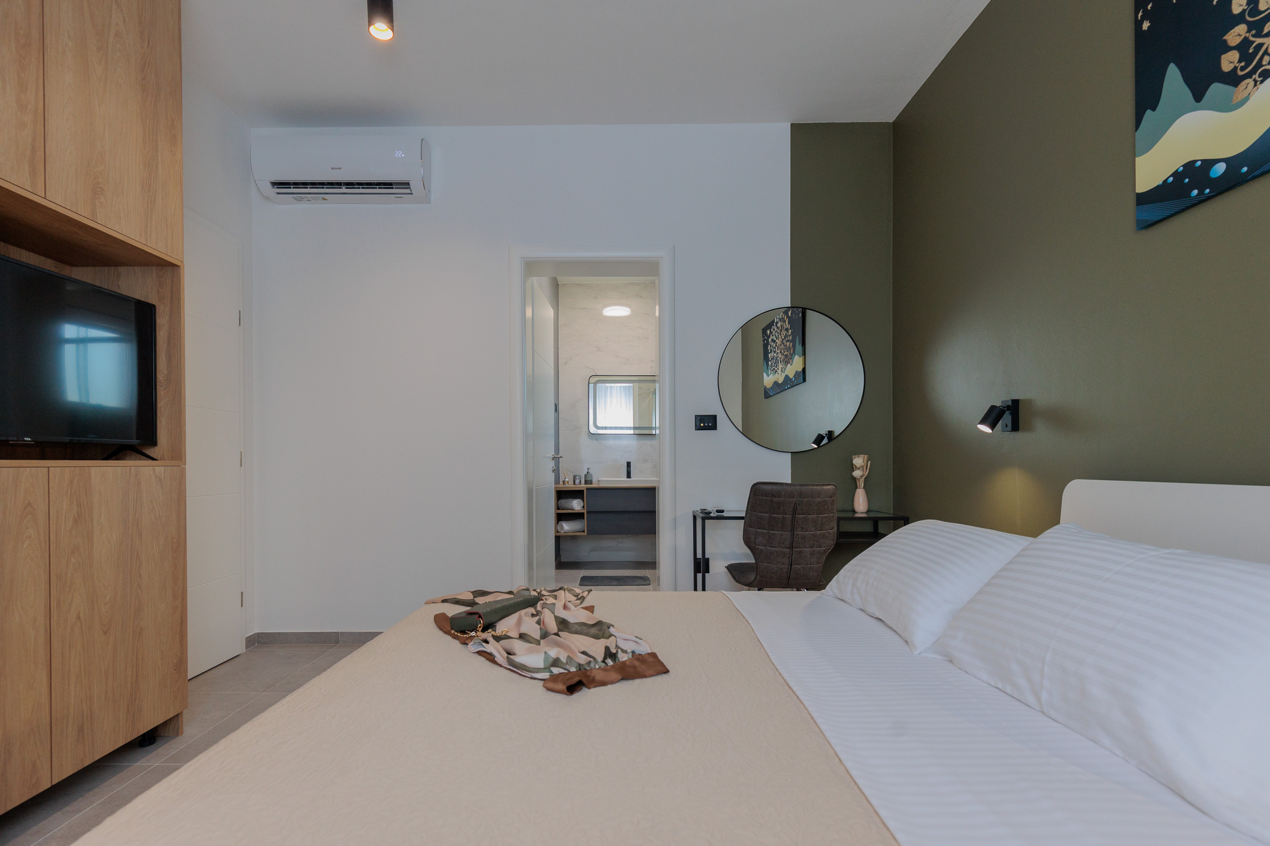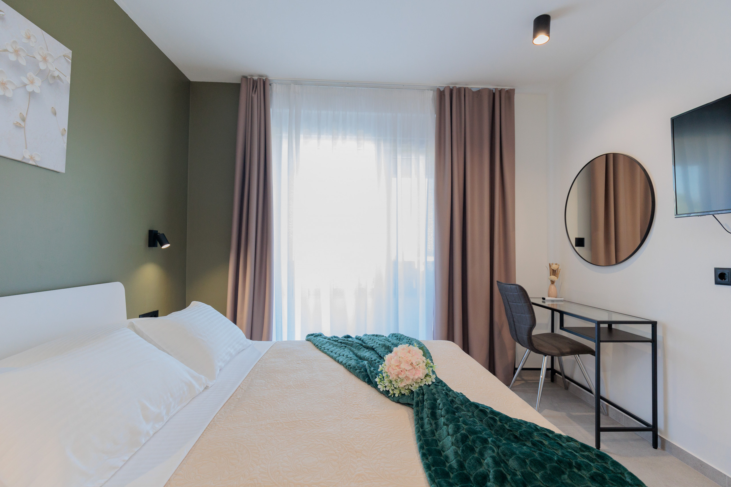 The comfortable living room is bathed in daylight and complemented by tasteful furniture. Fully equipped modern kitchen with high-end appliances that will satisfy even the most demanding cooks. The interior is thoughtfully decorated with interesting details and colors that blend harmoniously to create a visually stunning aesthetic.