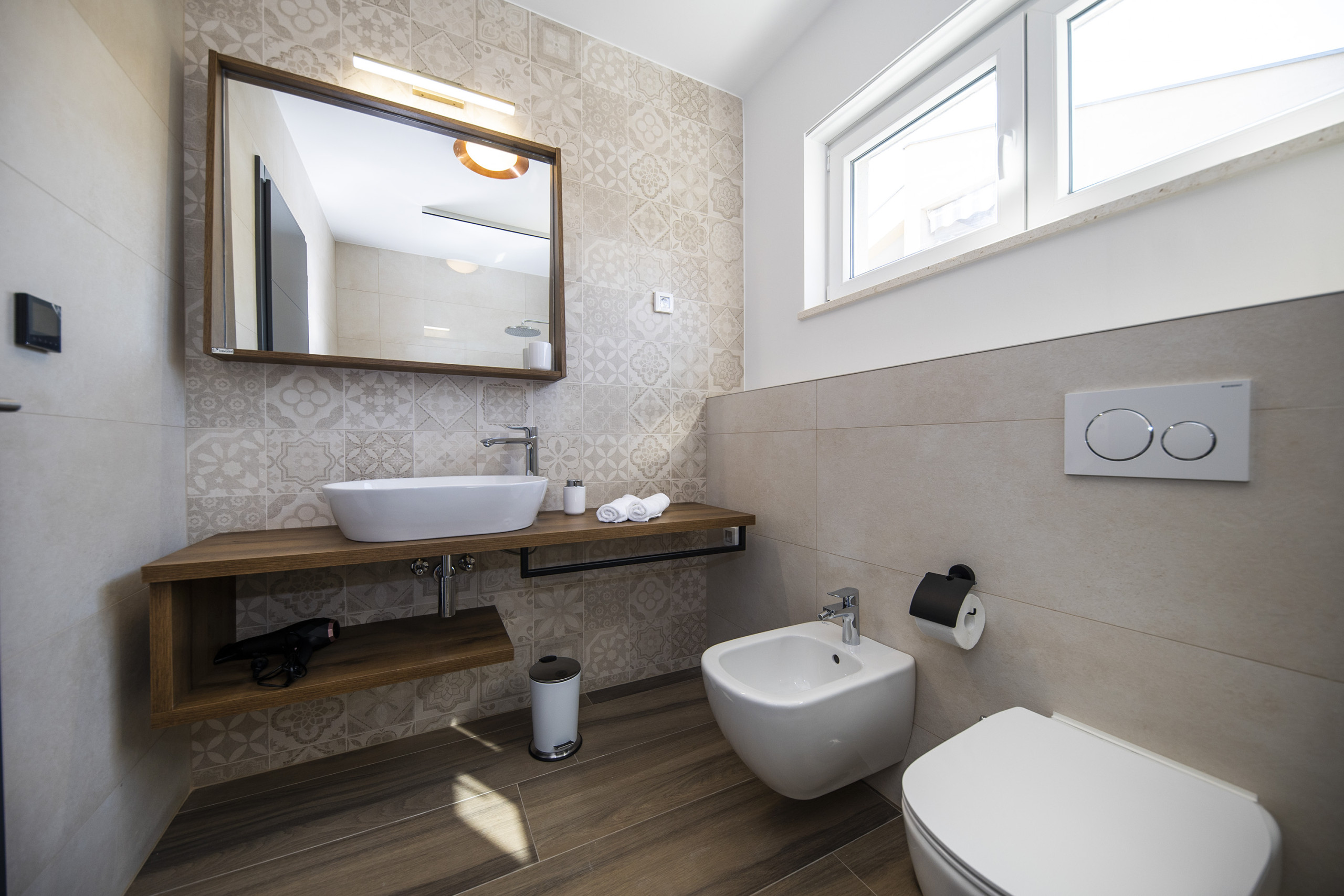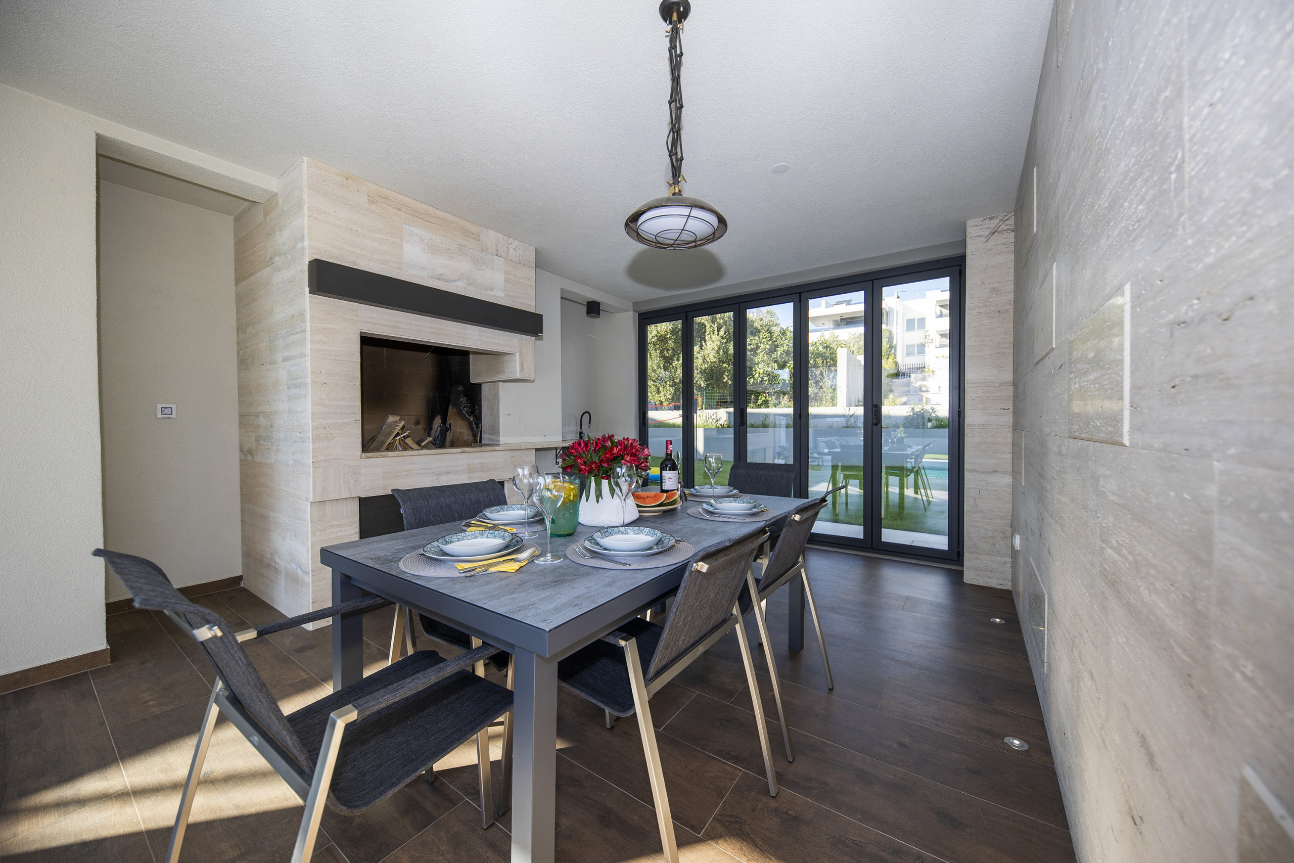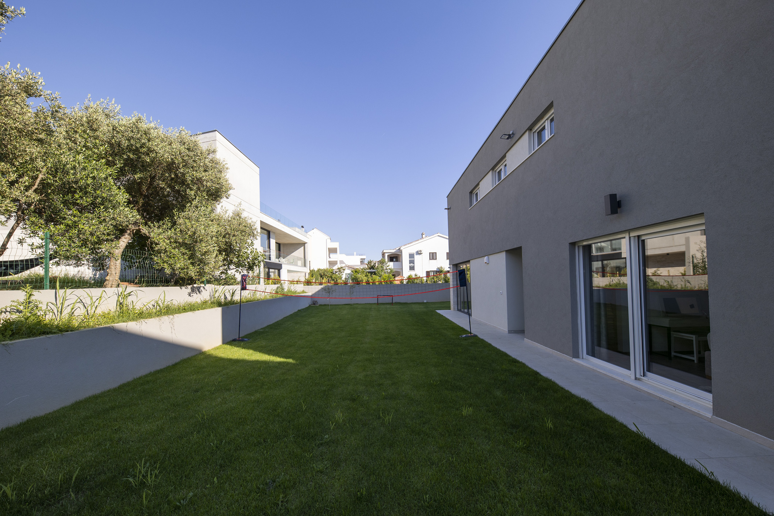 For guests with electric vehicles, there is an electric car charging station. The villa is fully enclosed and offers two to three parking spaces, ensuring maximum comfort and privacy. The villa also has a laundry room, a room on the ground floor with a washing machine and a tumble dryer.