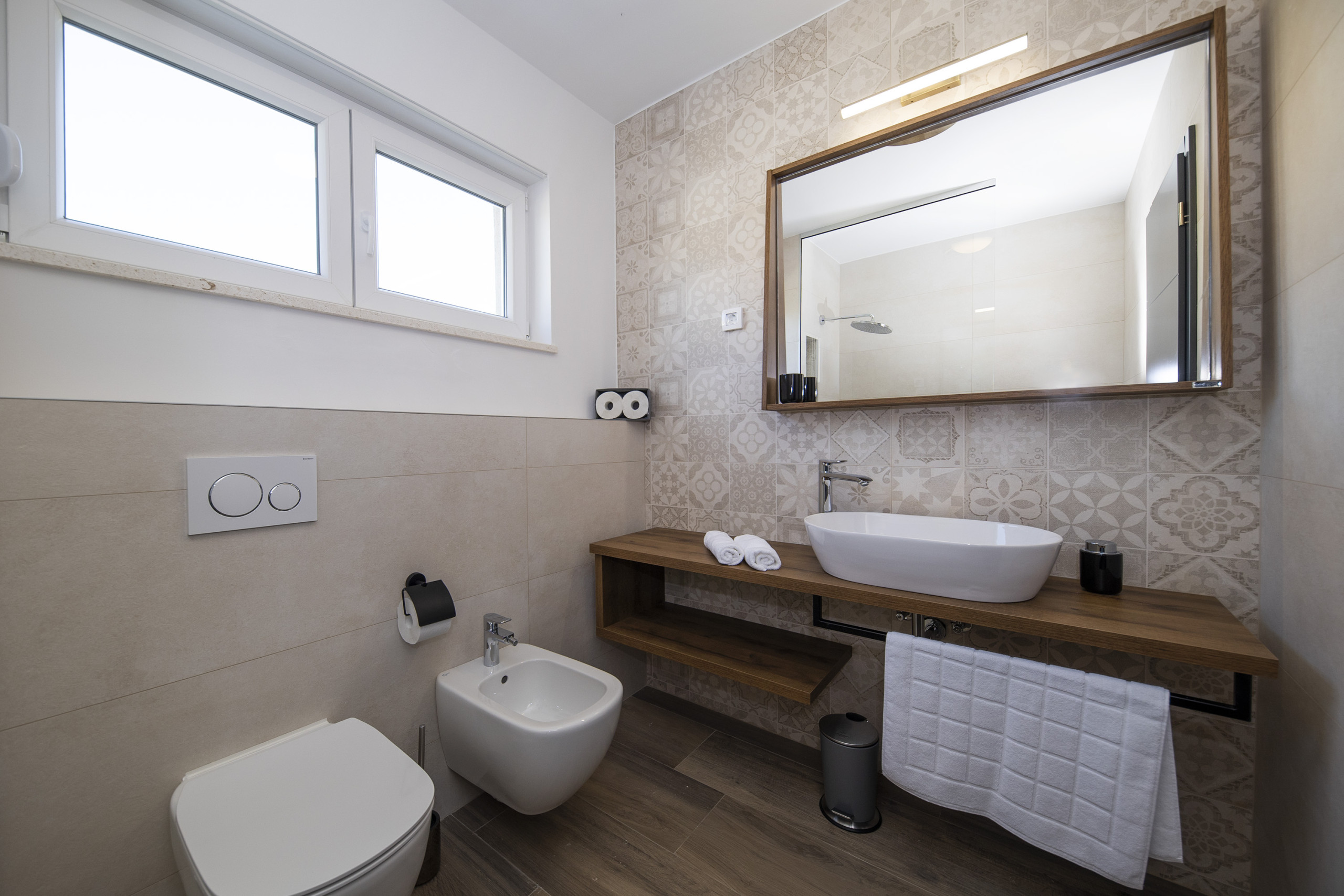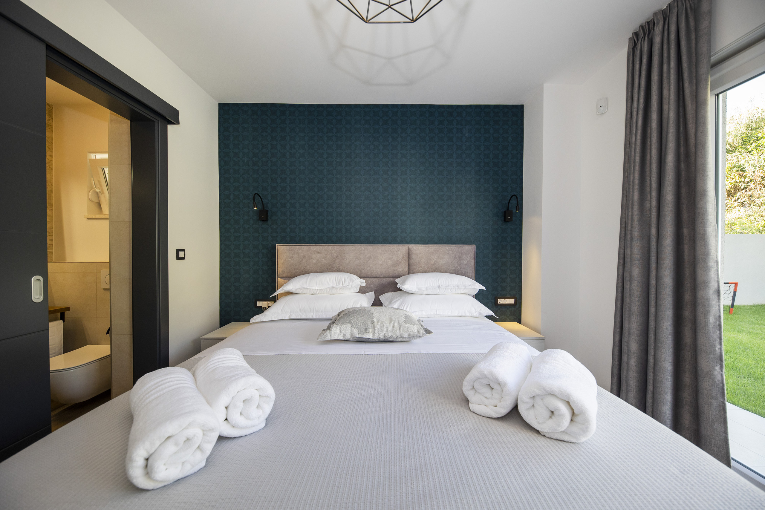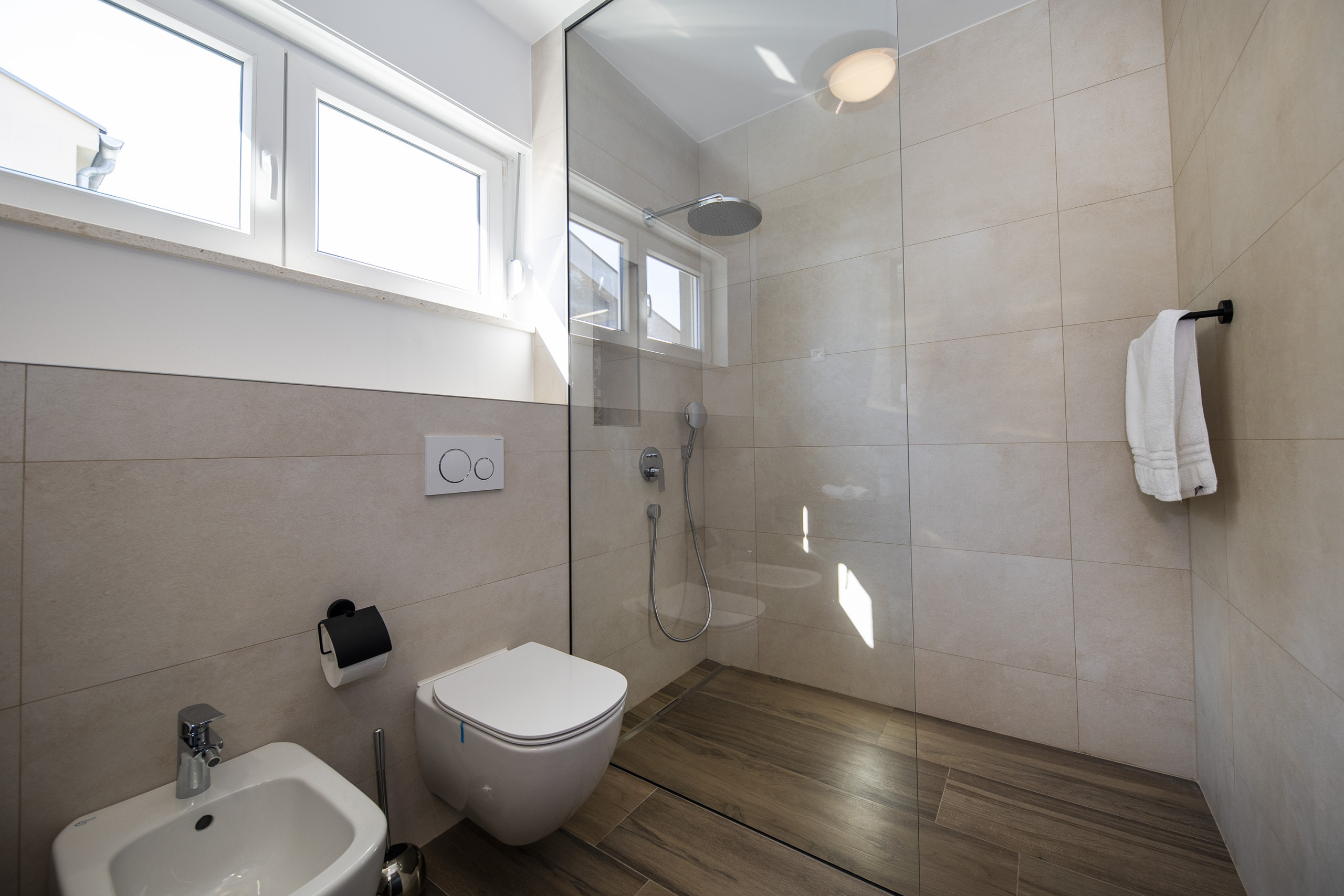 On the upper floor, there are three spacious bedrooms with double beds and two bedrooms have partial sea views. Each bedroom has its own en suite bathroom with a shower. On the ground floor there is another bedroom with a double bed. If you need additional sleeping arrangements, there is a pull-out sofa for two people. Upon request, a baby cot and high chair can be provided.