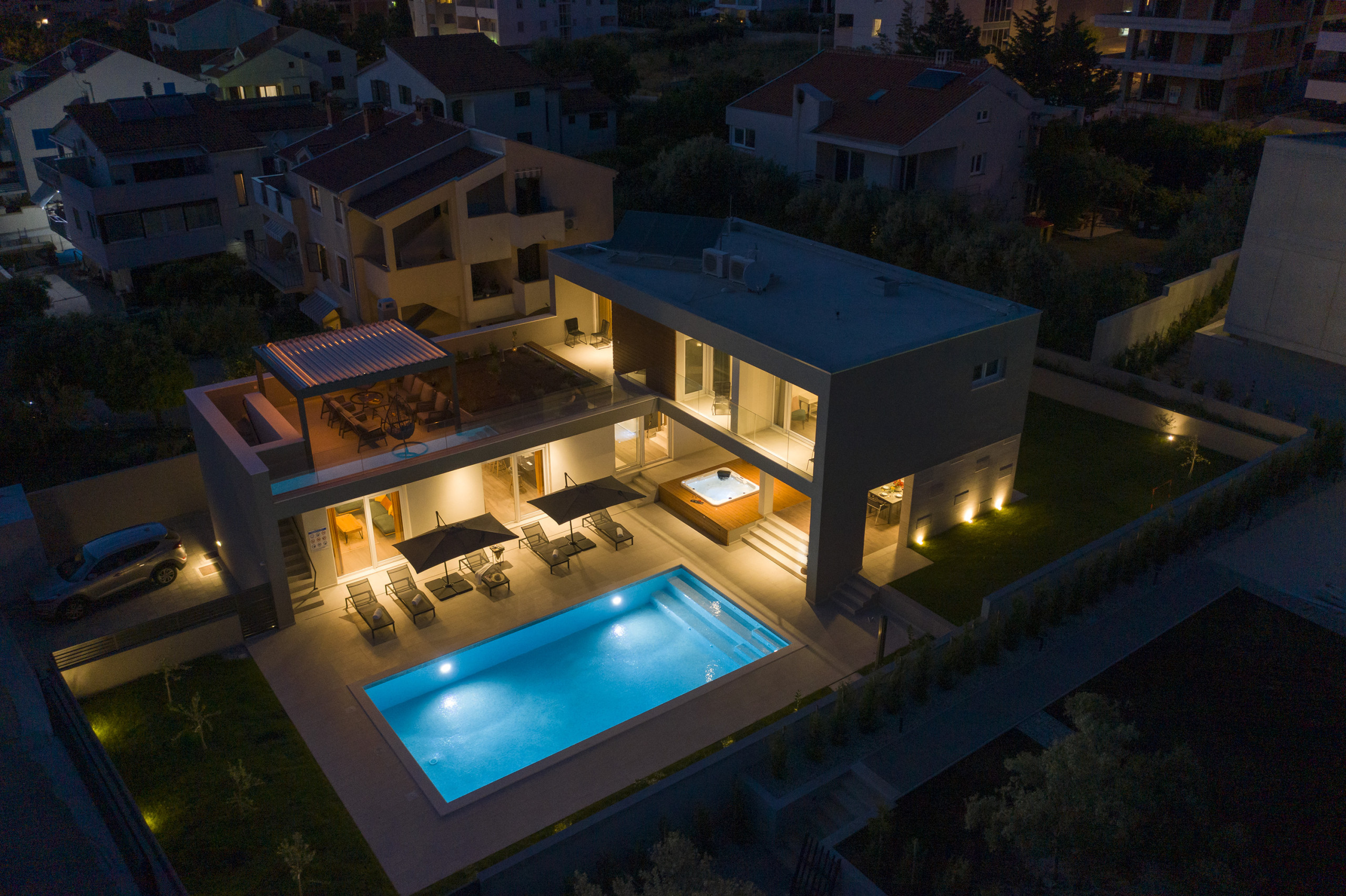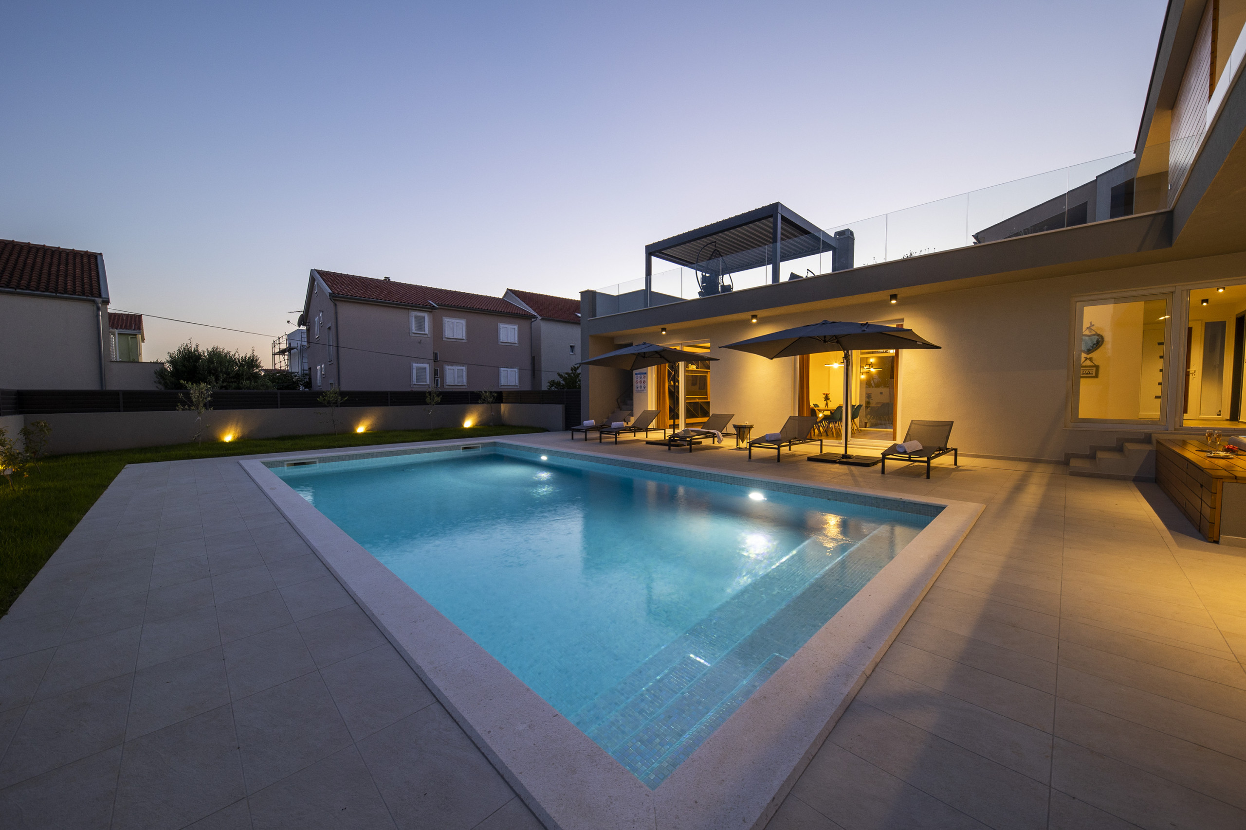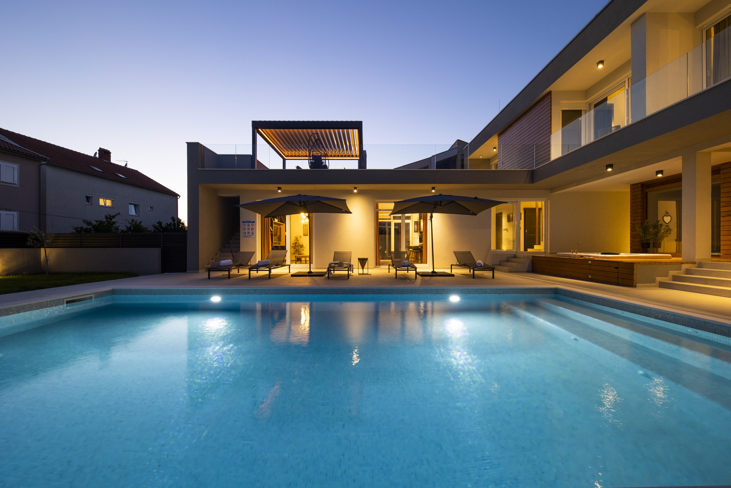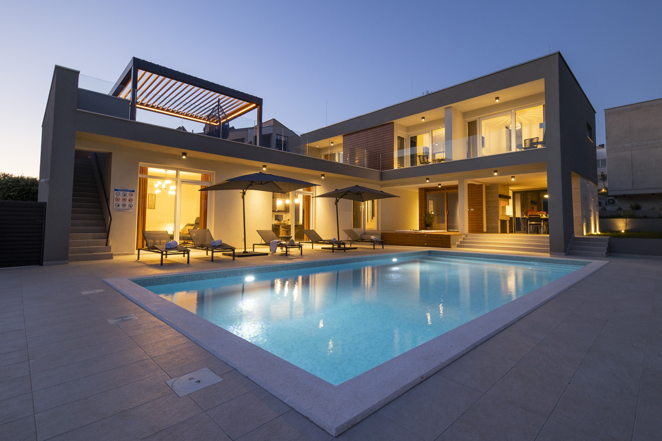 This Unique, modern and breath taking Panoramic View Villa is located in Zadar, 2.6 km from old city center. It is surrounded with relaxing sights at mountain Velebit, Adriatic sea and islands. Peaceful and quite area gives you total privacy, and still you are near to the city center if you want to explore something new.