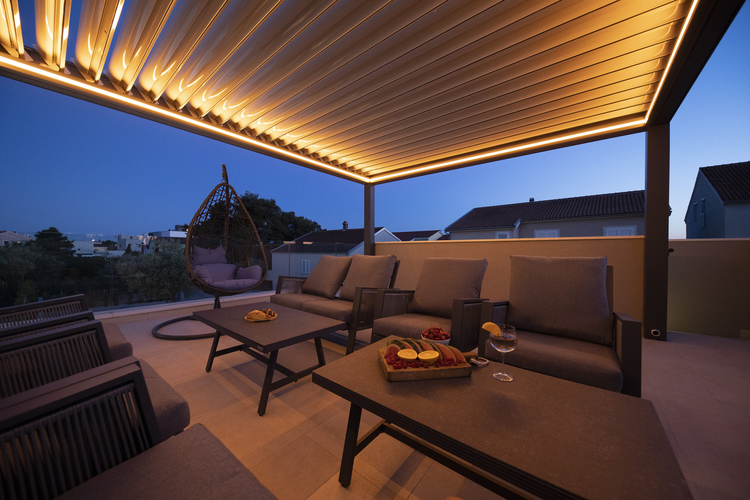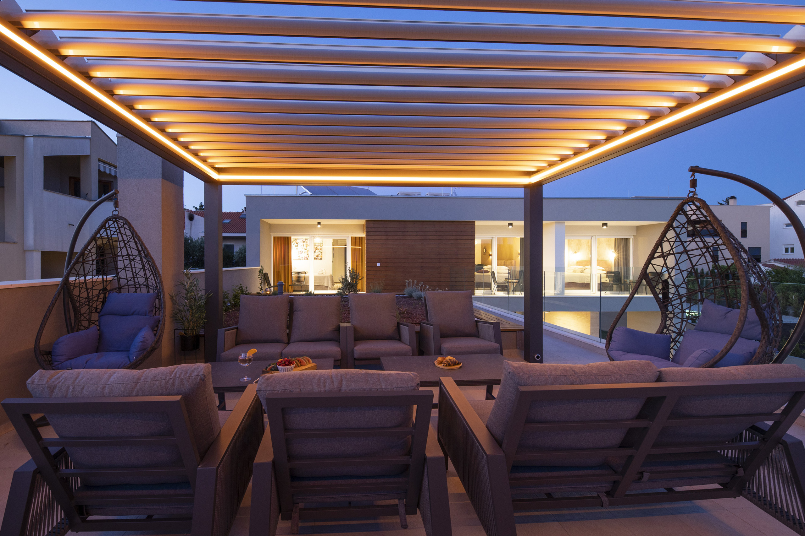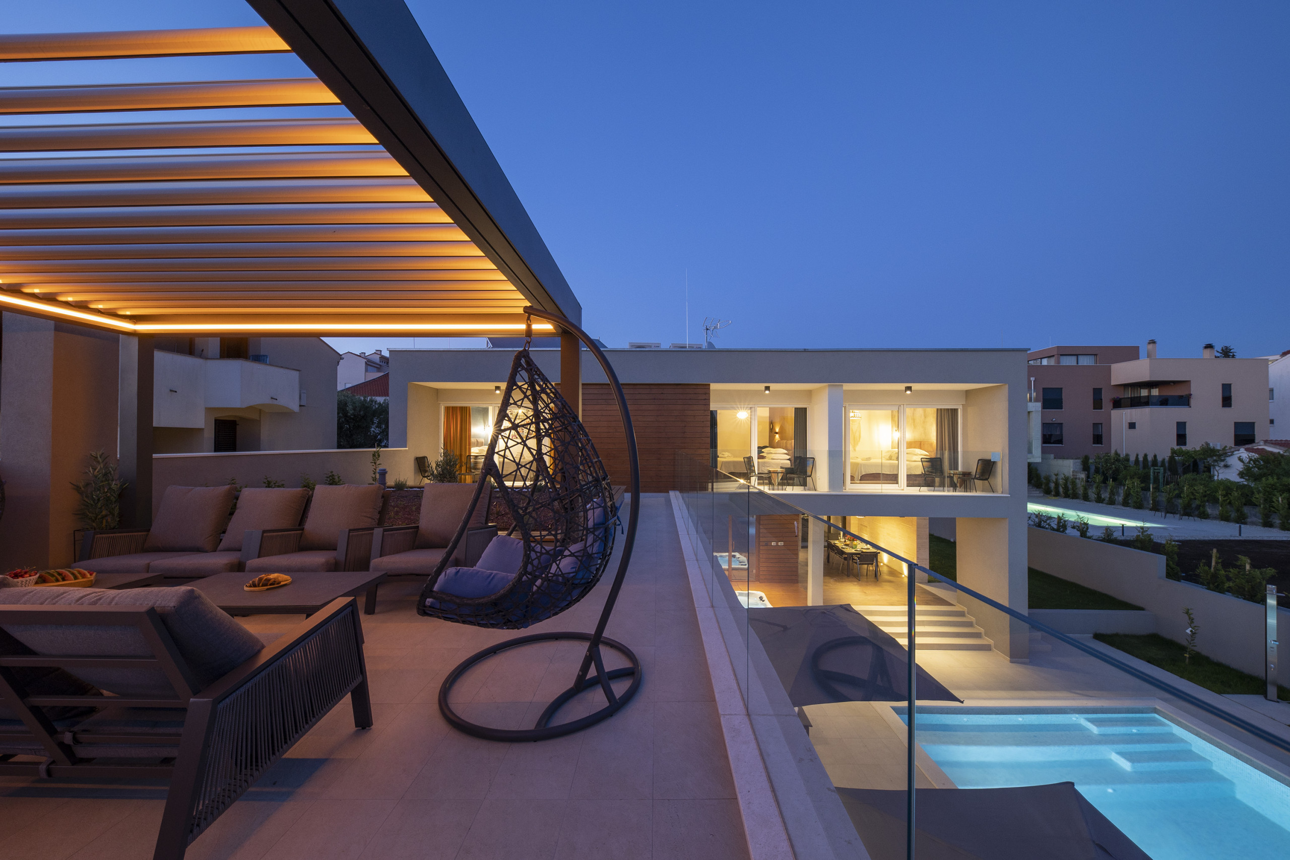 Also on this floor is a spacious terrace with a rooftop garden, which leads to the lounge area with comfortable seating for eight people. The lounge area includes two swings, perfect for relaxing and enjoying the company of family and friends with a view of the beautiful pool.