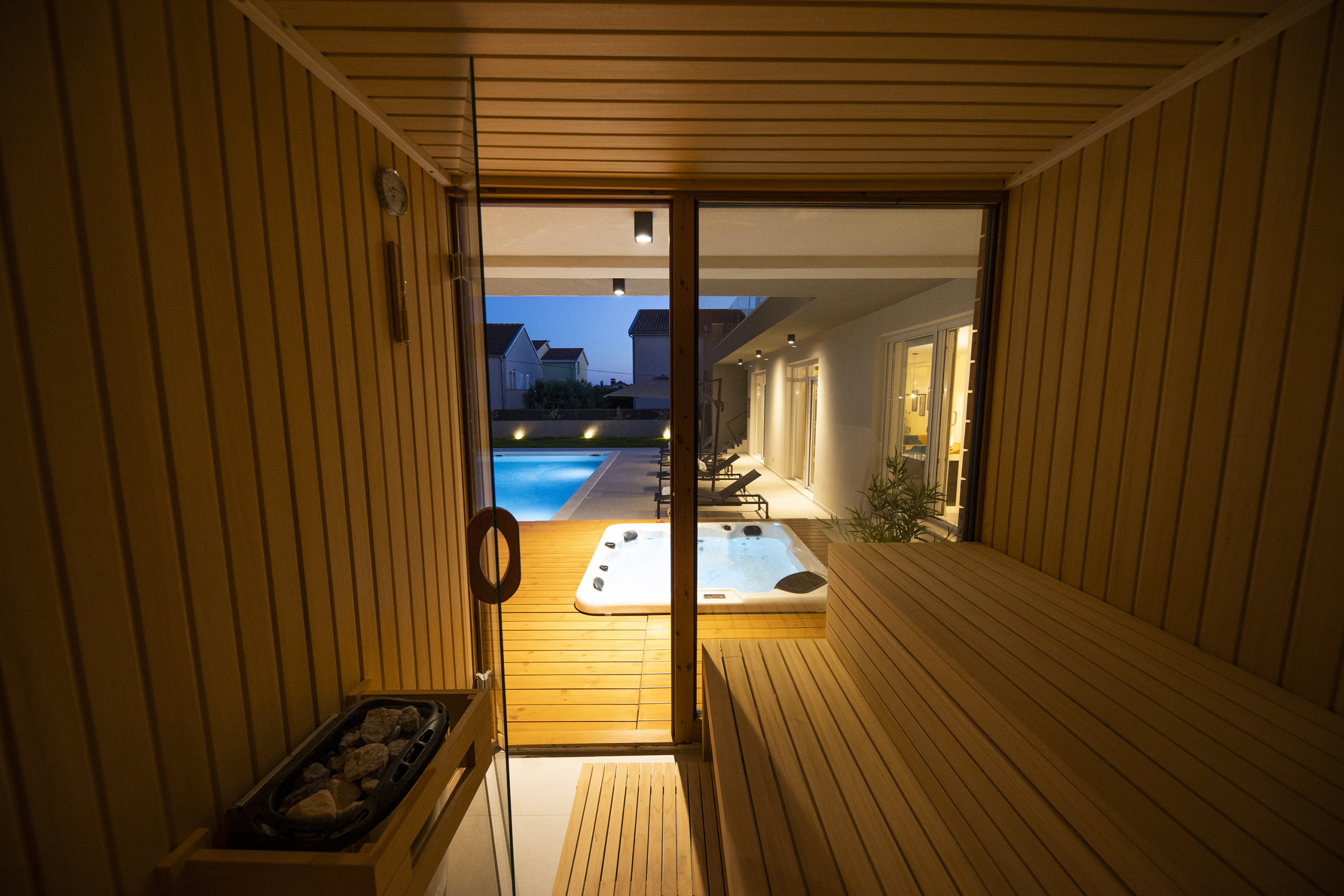 The outdoor area includes a large heated pool of 50 m², with five sunbeds for lounging. By the pool, there is also sports equipment such as water polo goals and a water basketball hoop, ideal for an active vacation. Next to the pool is an elegant summer kitchen, perfect for a meal after swimming, with a charcoal or wood-burning grill. You can also unwind in the Finnish sauna or the jacuzzi, which is perfect for a night swim and pleasant conversations. In the garden of this beautiful villa, there is also a volleyball court.