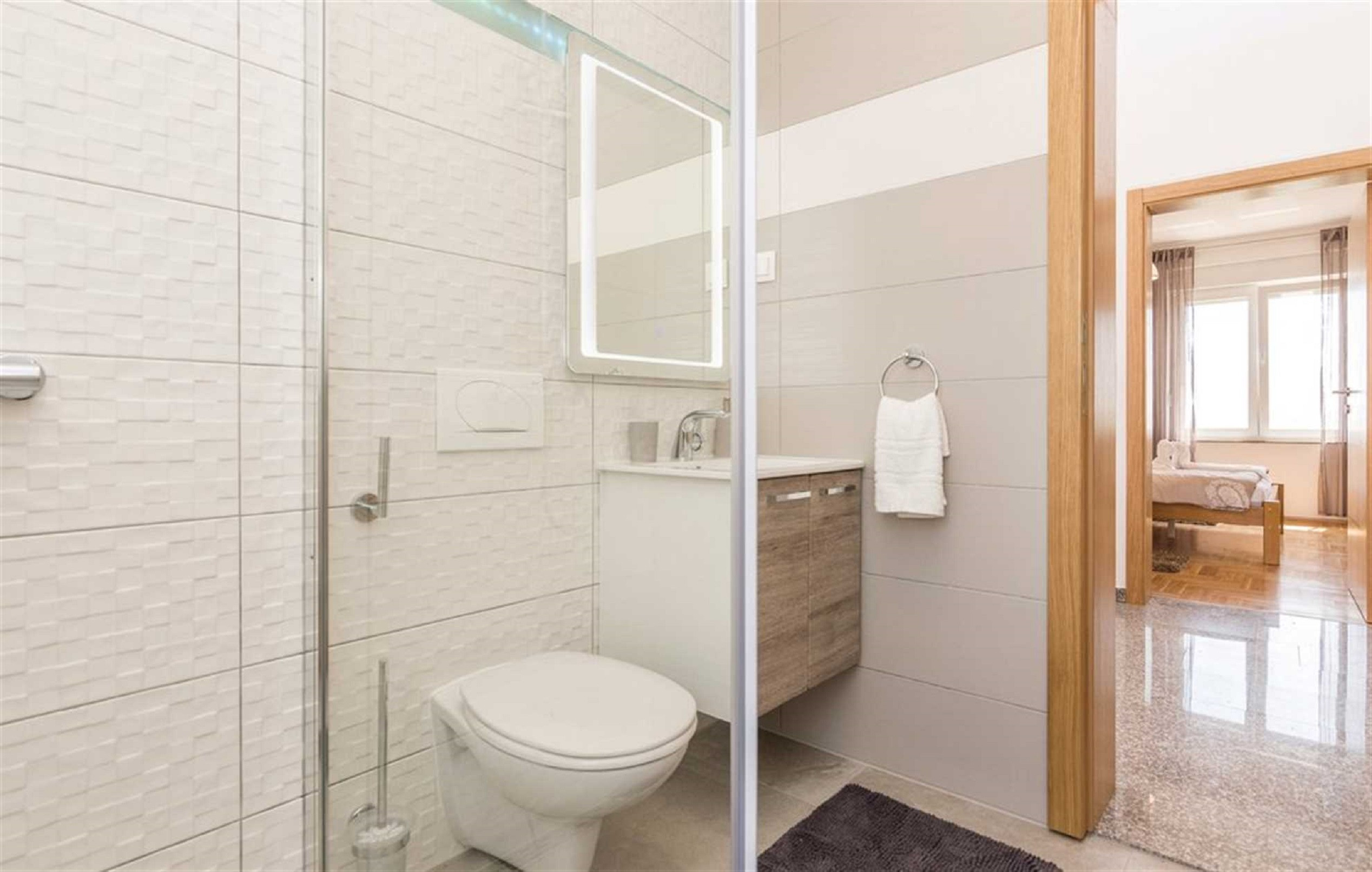 On the upper floor, there are three spacious bedrooms with double beds and two bedrooms have partial sea views. Each bedroom has its own en suite bathroom with a shower. On the ground floor there is another bedroom with a double bed. If you need additional sleeping arrangements, there is a pull-out sofa for two people. Upon request, a baby cot and high chair can be provided.