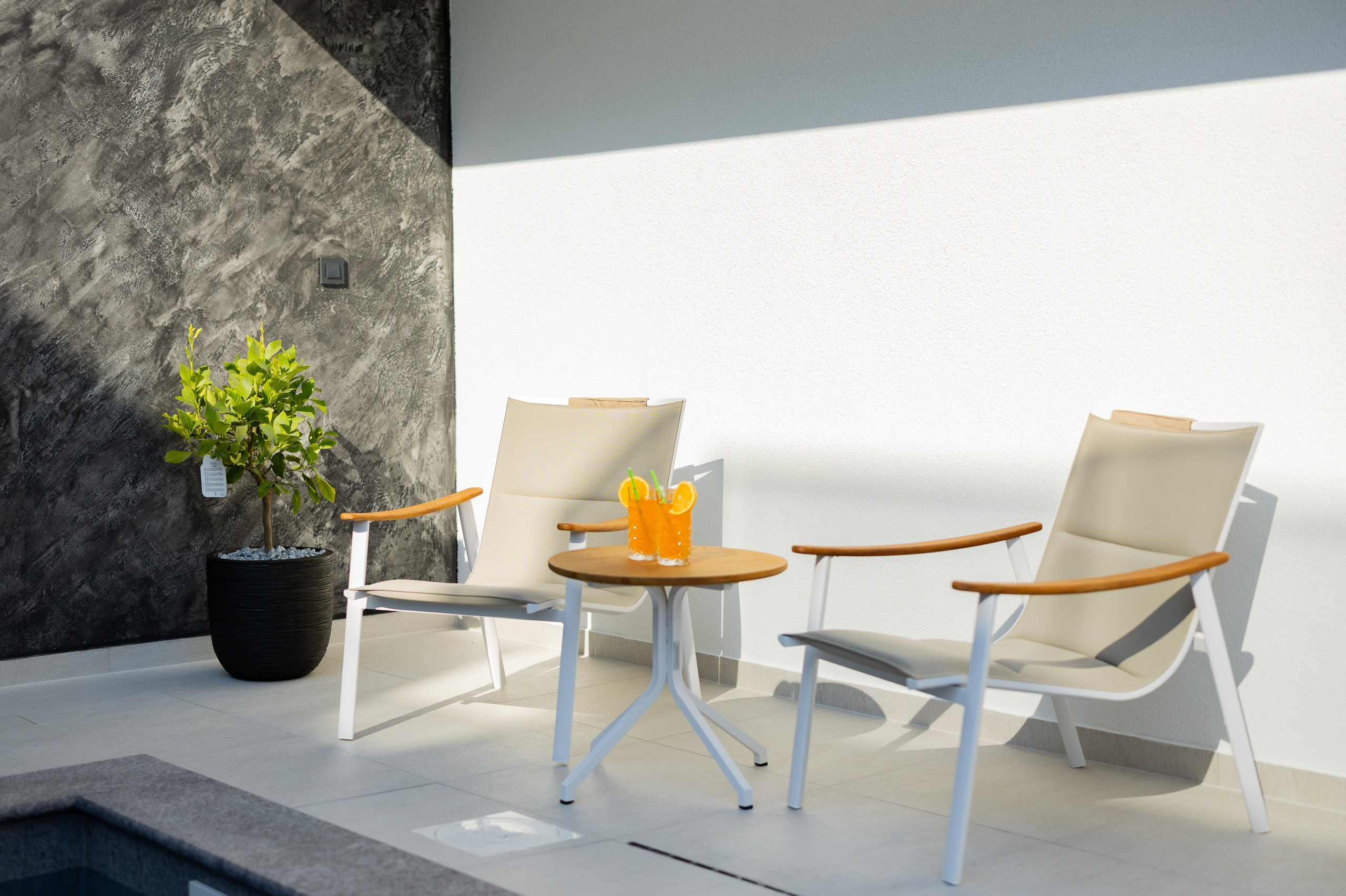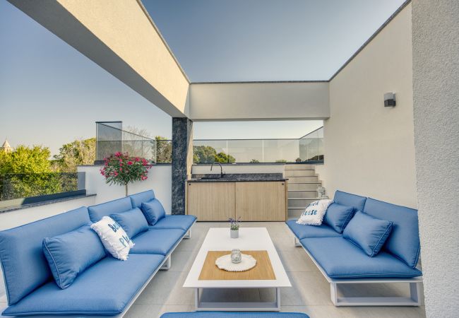 The second floor is a true highlight of the villa, featuring a shaded terrace with a comfortable lounge set, a summer kitchen with a bar fridge, and a pool.