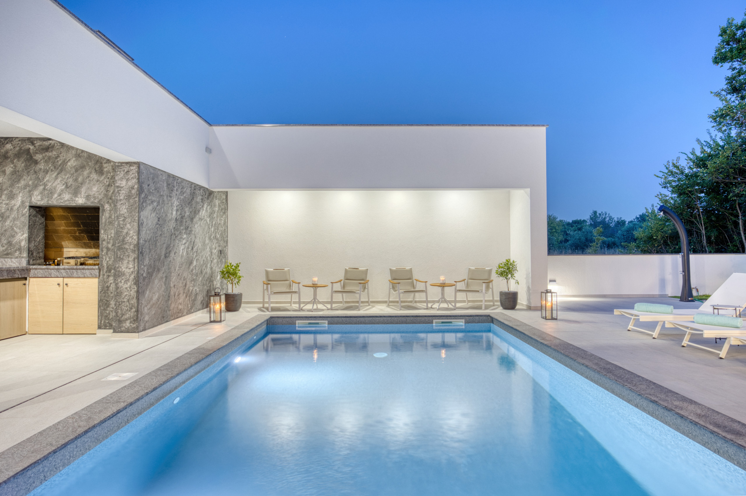 Outside, guests can enjoy a heated pool (32 m²), an outdoor shower, sun loungers, umbrellas, and a charming sitting area. There’s also a built-in barbecue with a sink and an outdoor dining table for al fresco meals. The entire yard is fully fenced, offering complete privacy, and three private parking spaces are available.