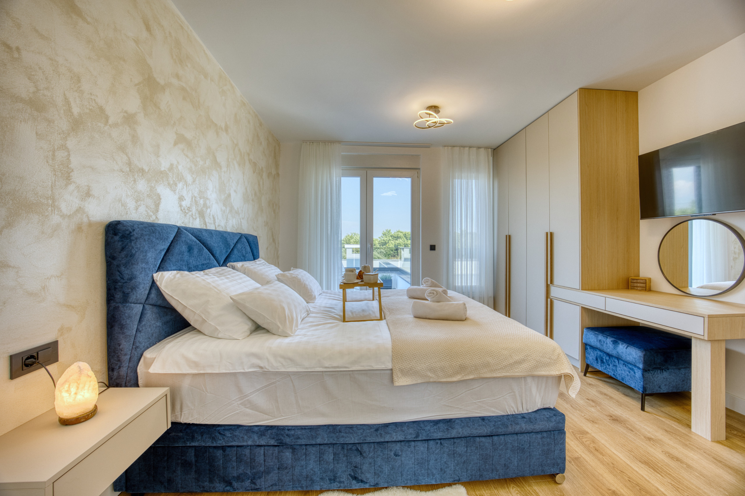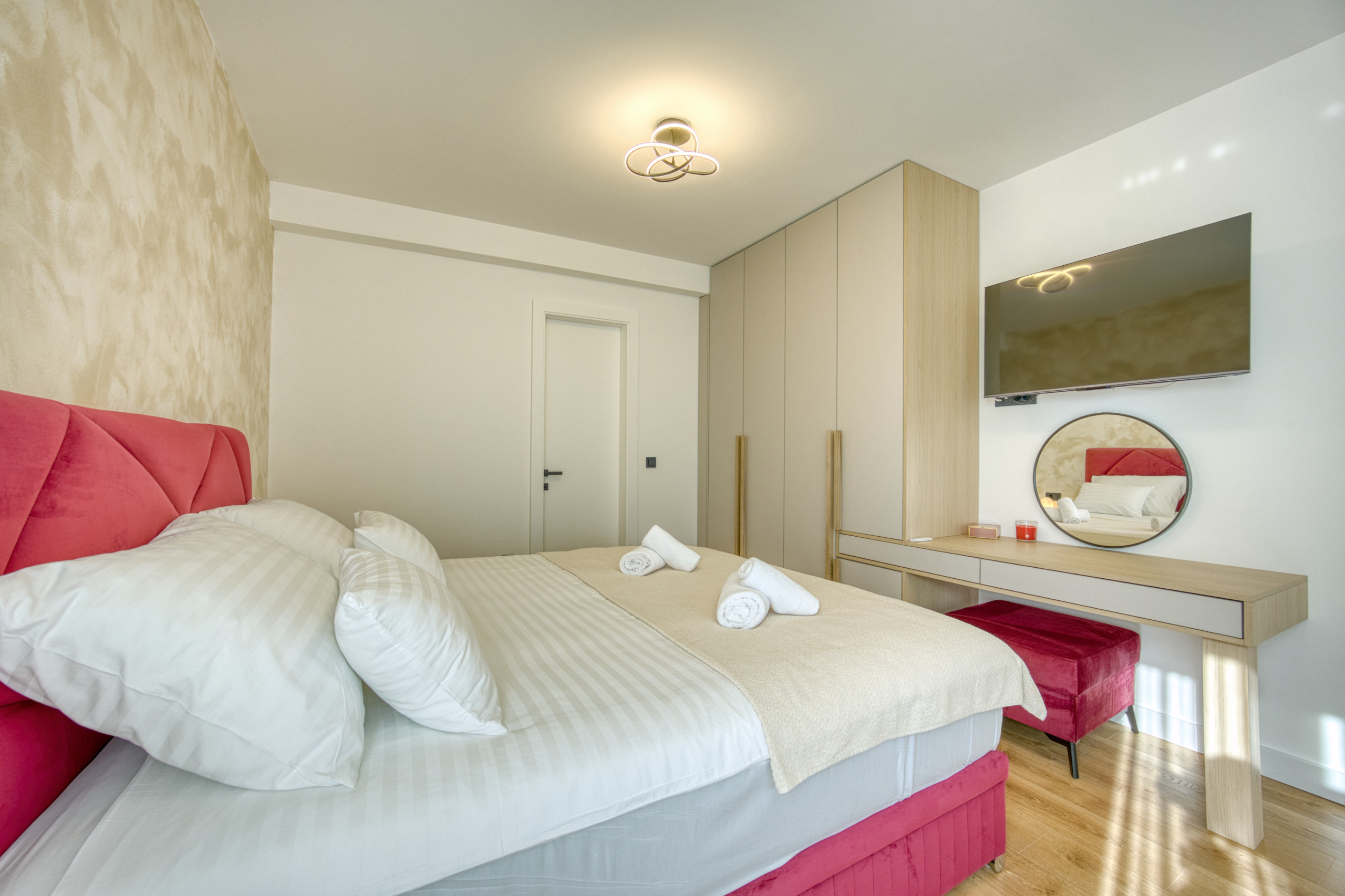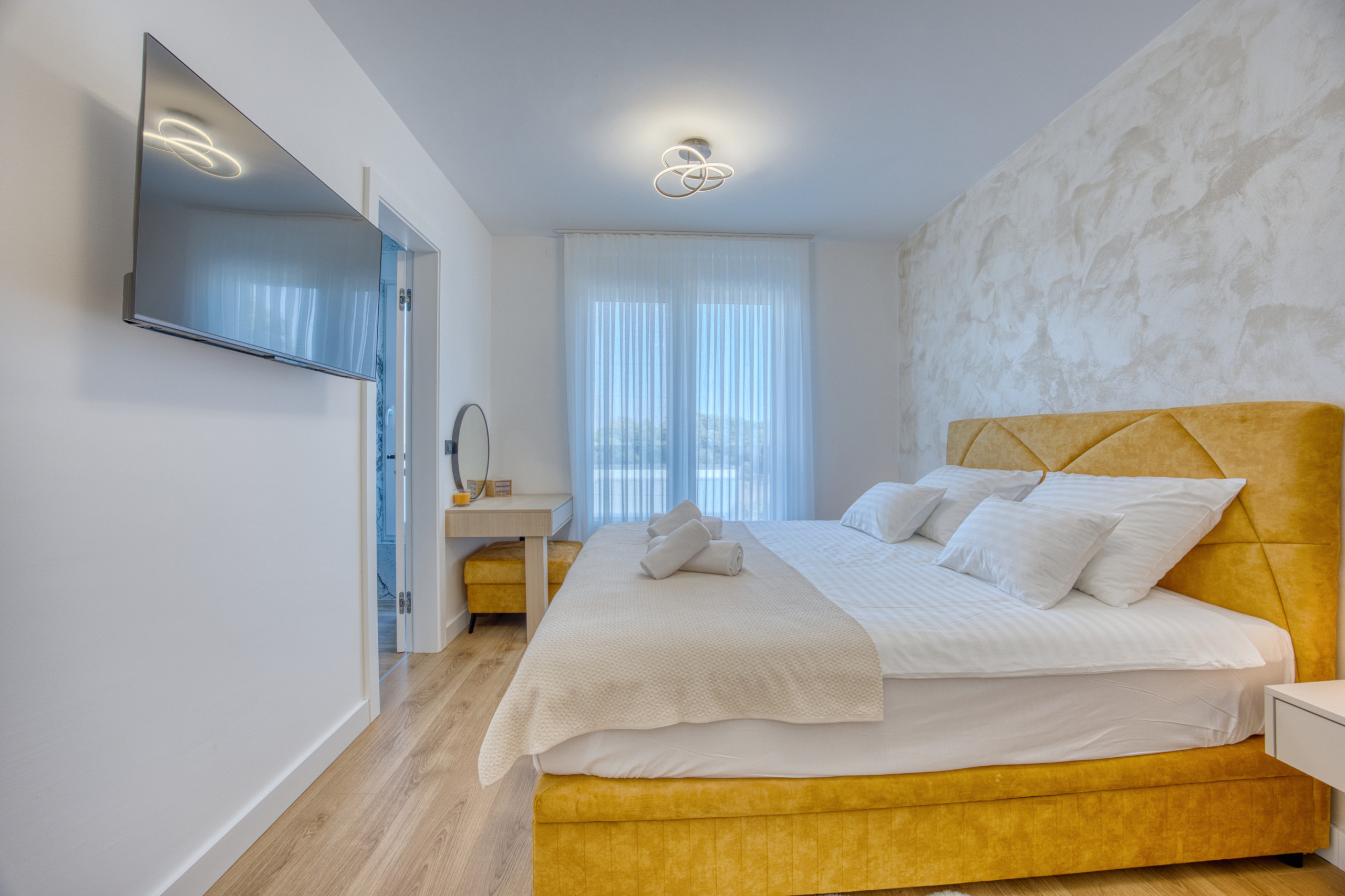 The first floor offers four spacious bedrooms, each with a double bed, air conditioning, a TV, and a private en-suite bathroom with a shower – ensuring comfort and privacy for all guests.