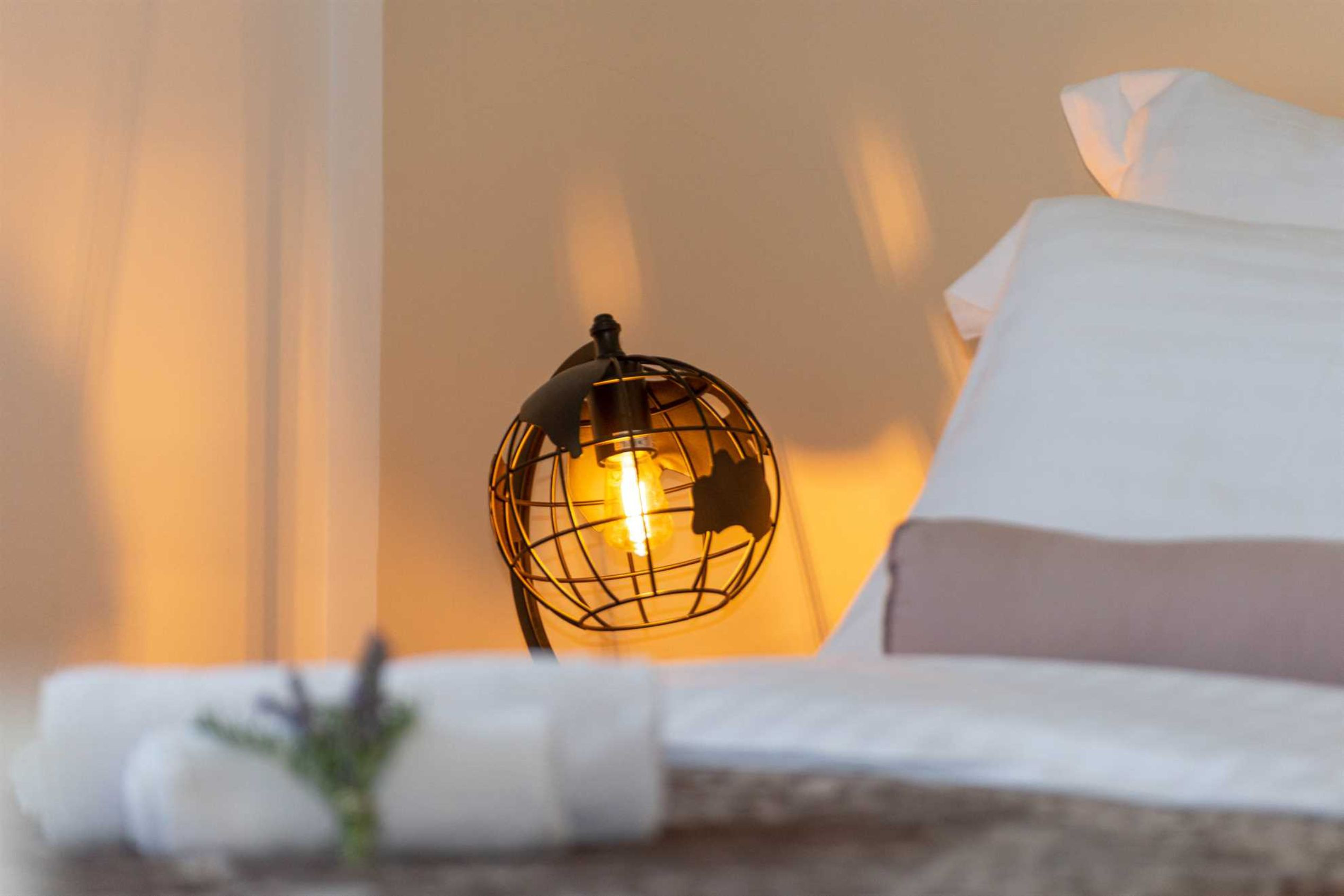 The Villa is a part of a completely enclosed property and is surrounded by olive tree planatations and vineyards. It has an open-concept living room, dining room and kitchen, boasting in mixed decorative elements of the modern, the rustic and the industrial. It has a total of 4 bedrooms. The main part of the Villa has 3 bedrooms, one with a king sized bed with an en-suite bathroom, one with a queen sized bed and one with twin beds, as well as another bathroom. One bedroom with a queen sized bed is part of a smaller part of the Villa with a separate entrance, that also has a small kitchen, living room and a bathroom.