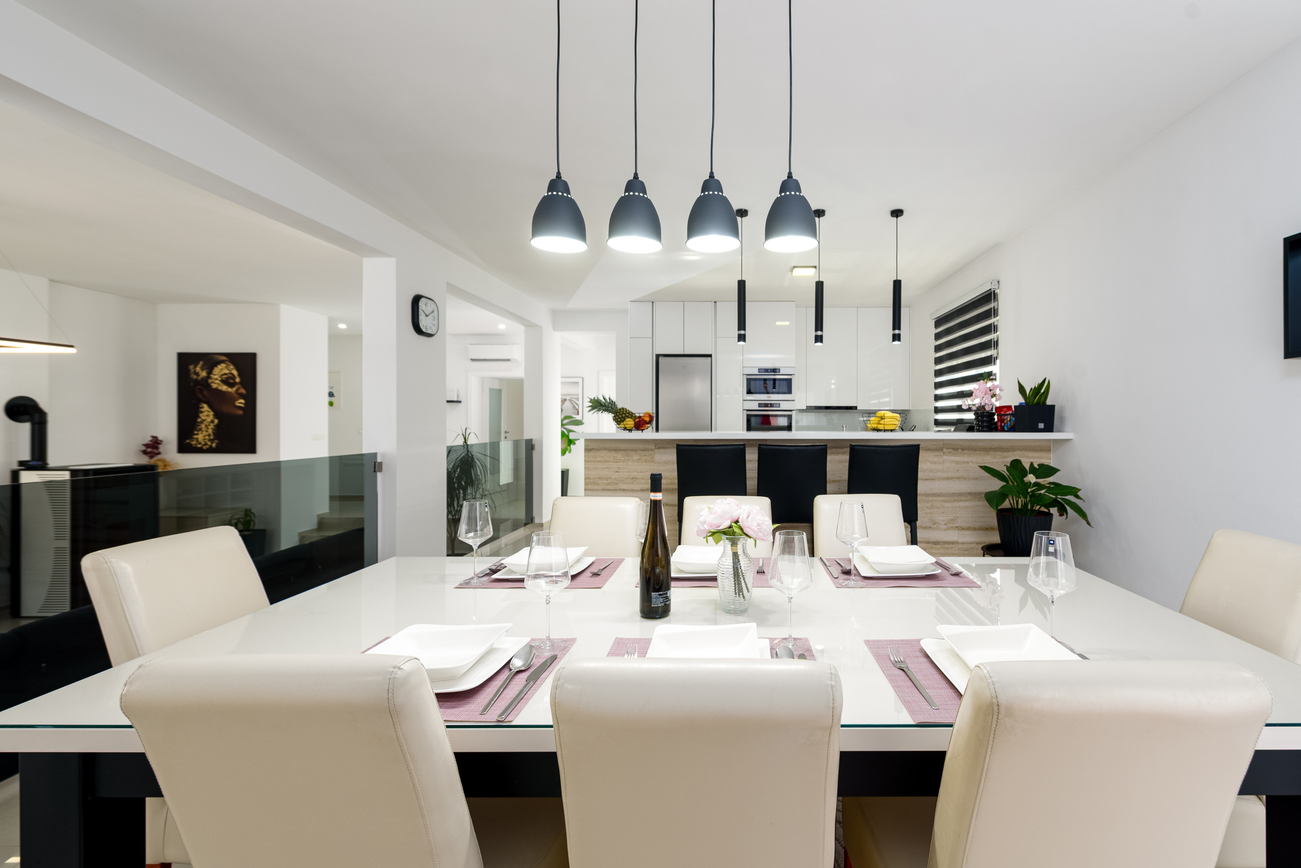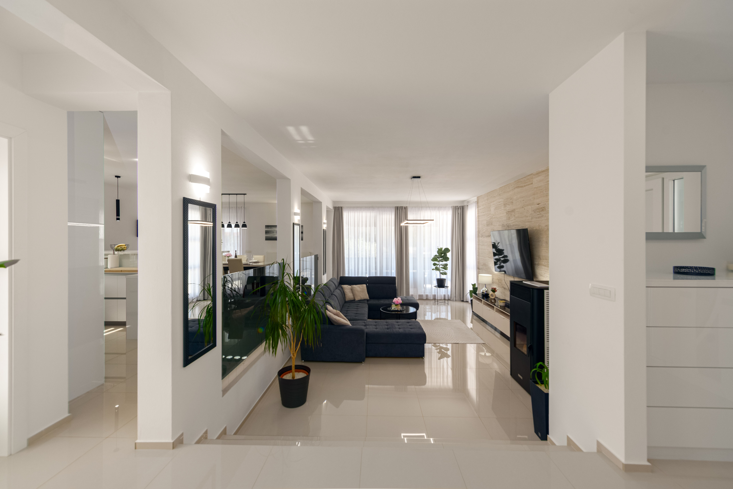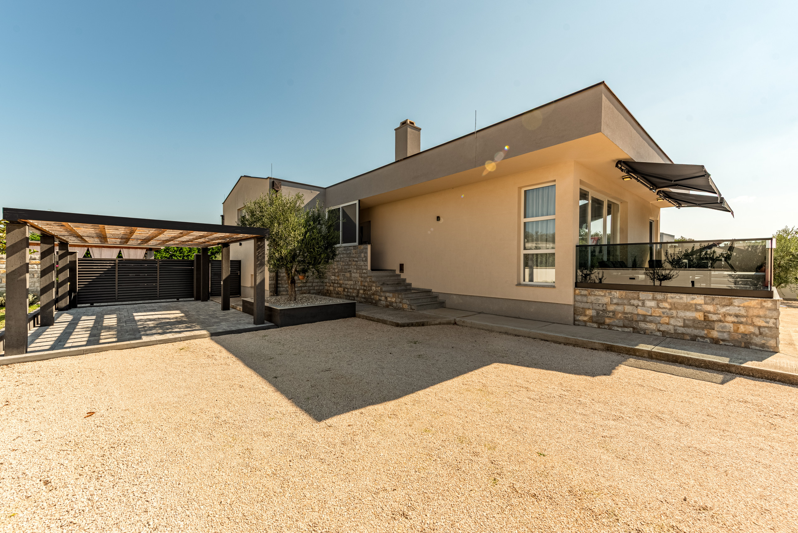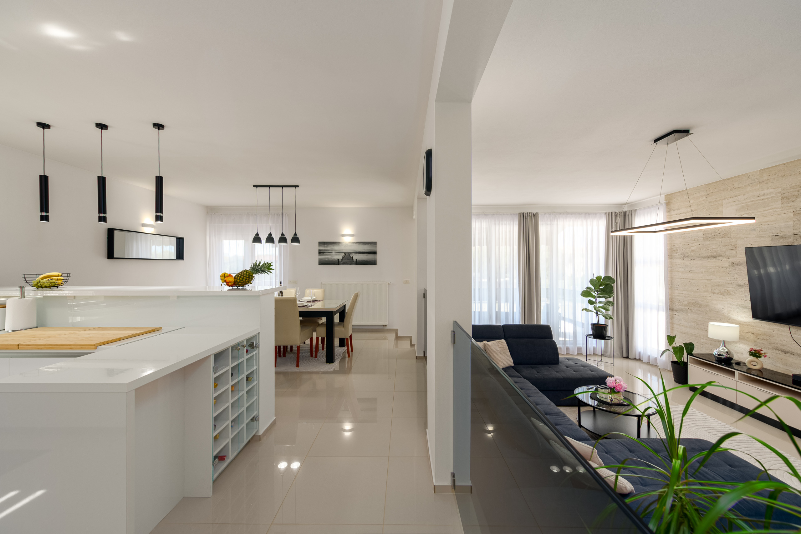 This modern and functionally designed villa accommodates up to six guests and offers three comfortable bedrooms, each with a double bed. Guests have access to two fully equipped bathrooms, as well as an elegant, modern kitchen that seamlessly blends into an open-plan space with a spacious and cozy living room – perfect for relaxation and socializing.