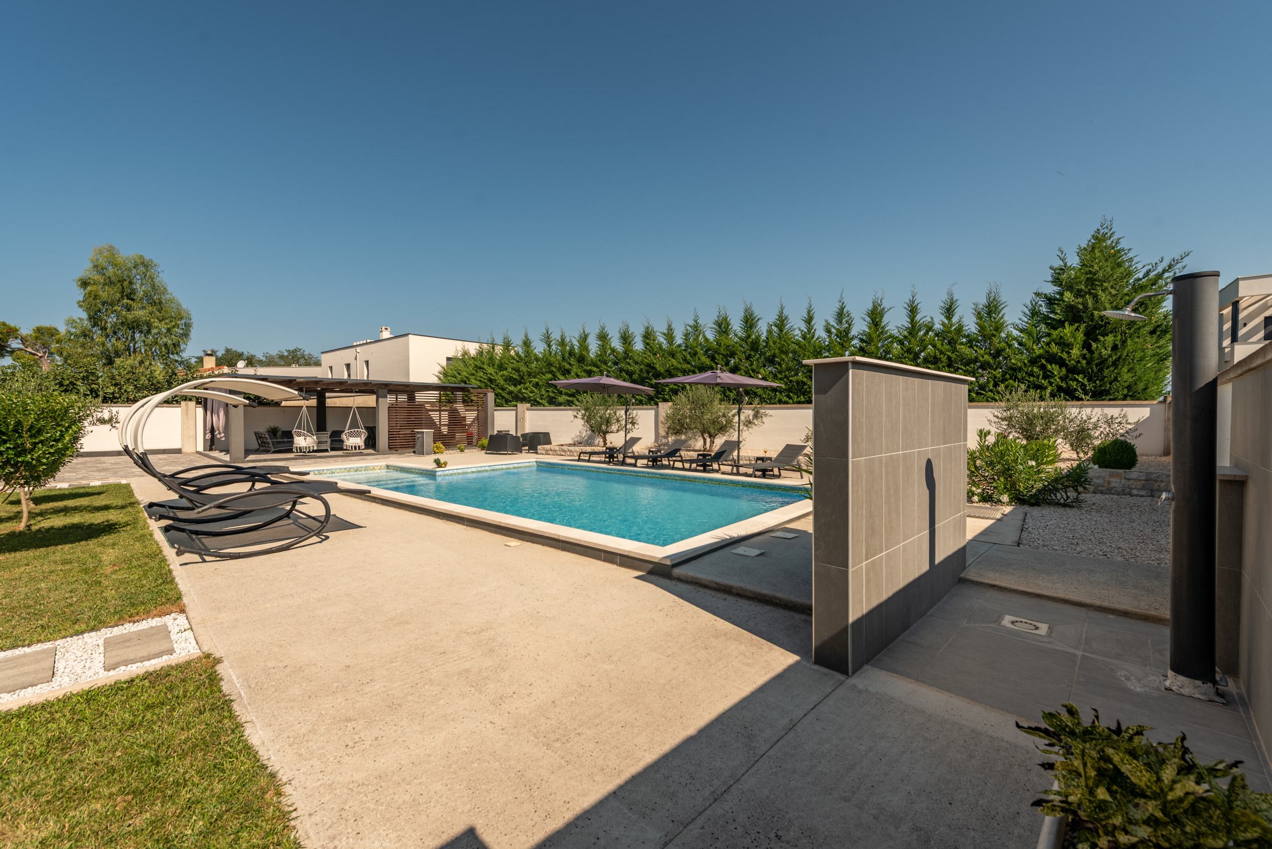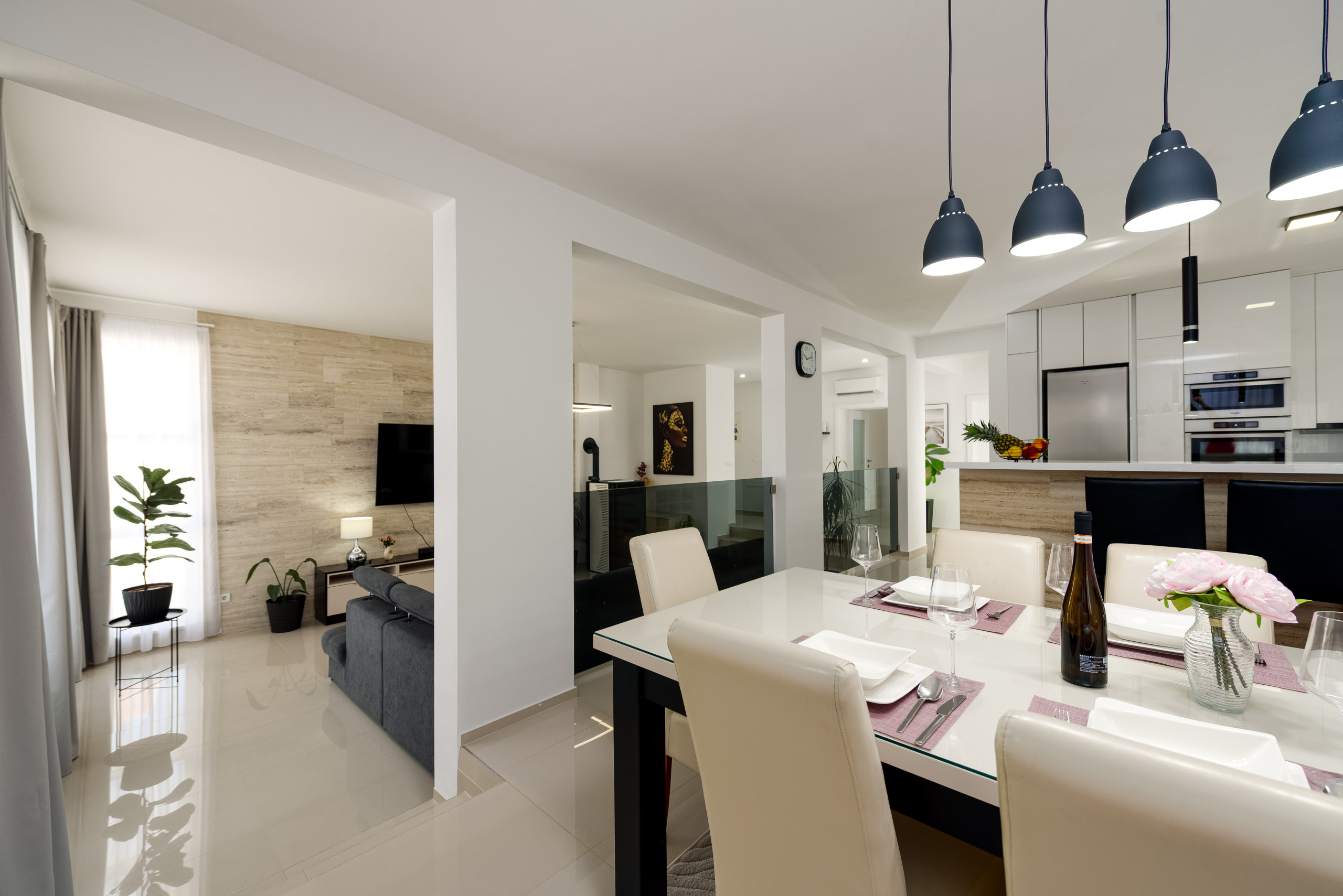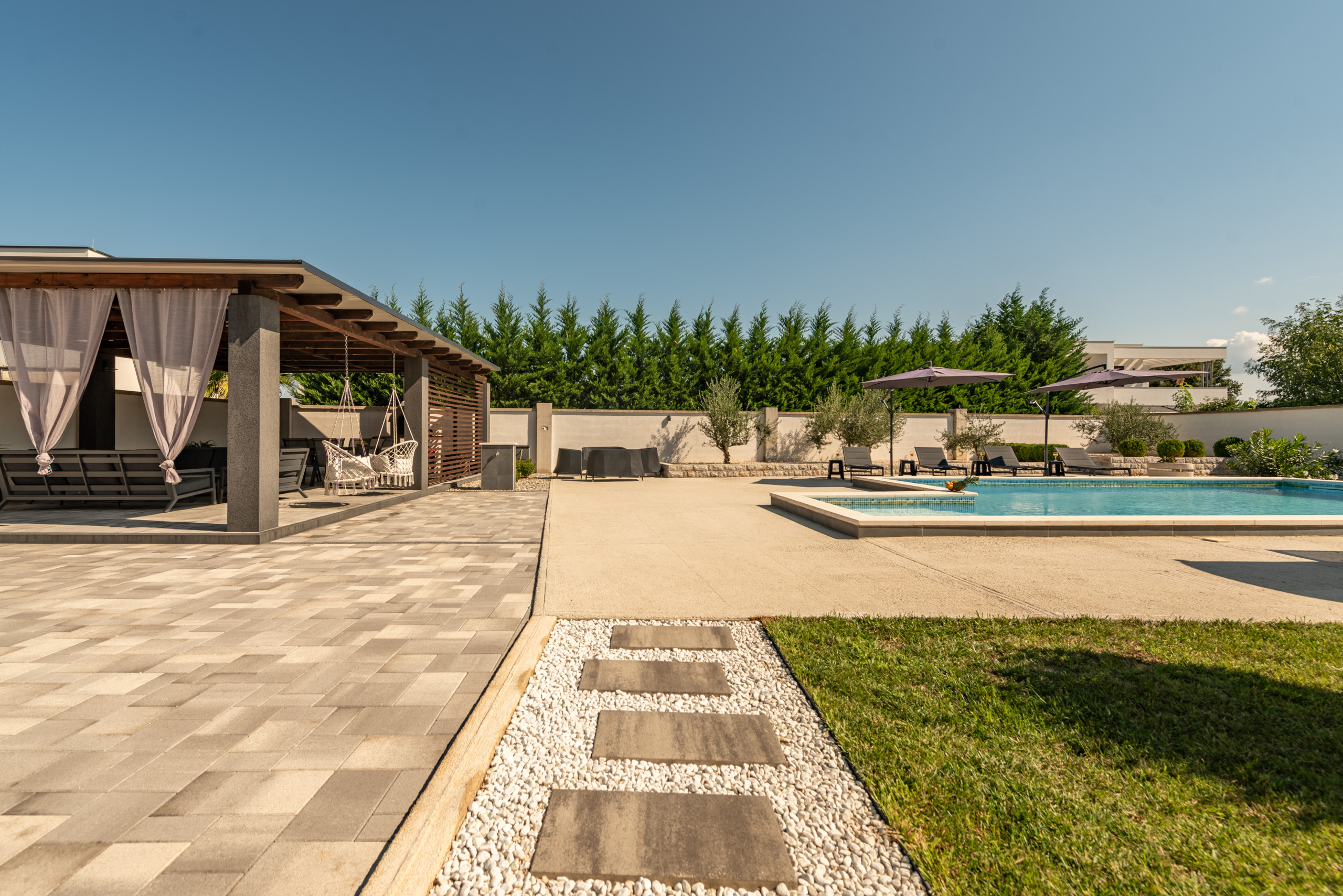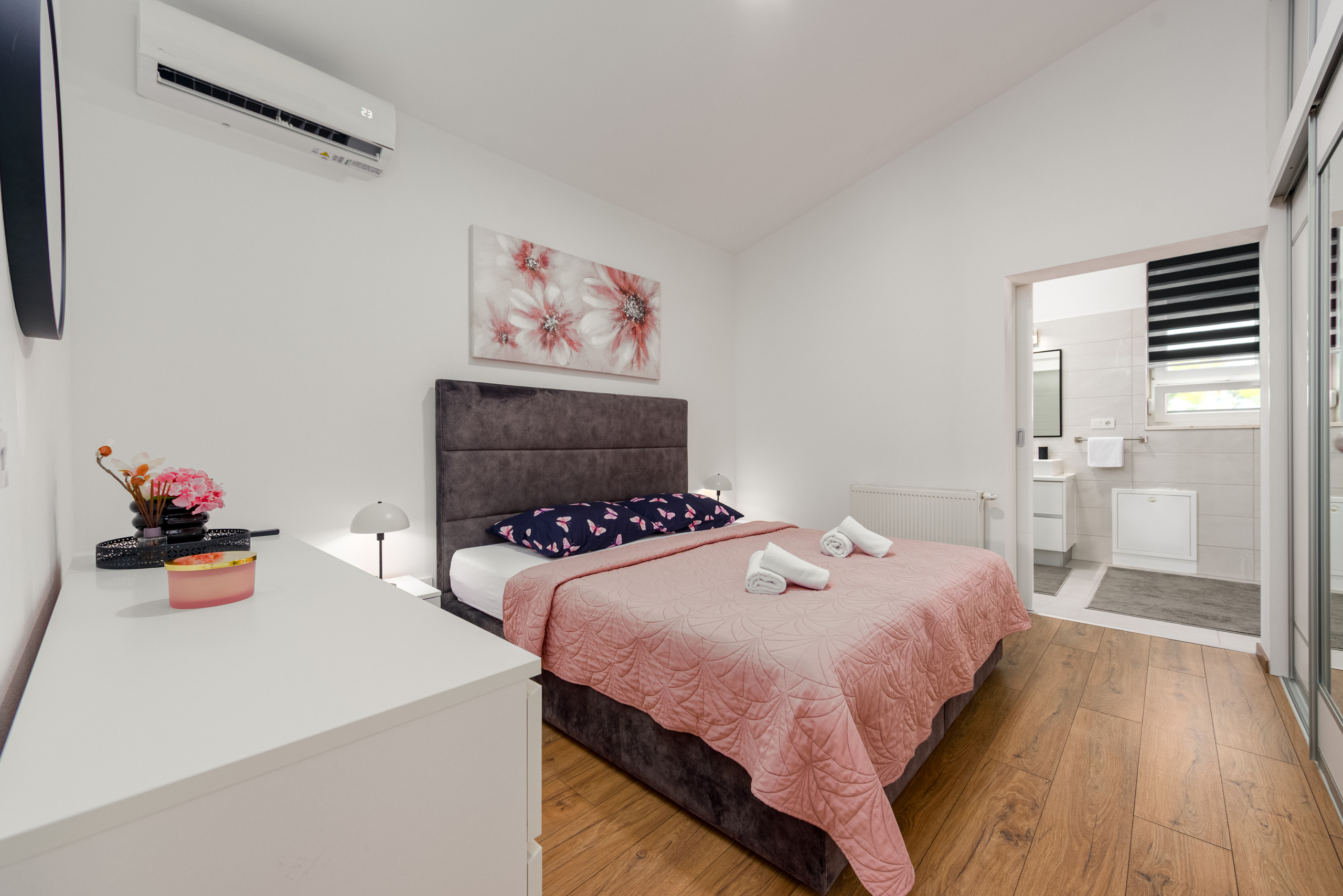 This modern and functionally designed villa accommodates up to six guests and offers three comfortable bedrooms, each with a double bed. Guests have access to two fully equipped bathrooms, as well as an elegant, modern kitchen that seamlessly blends into an open-plan space with a spacious and cozy living room – perfect for relaxation and socializing.