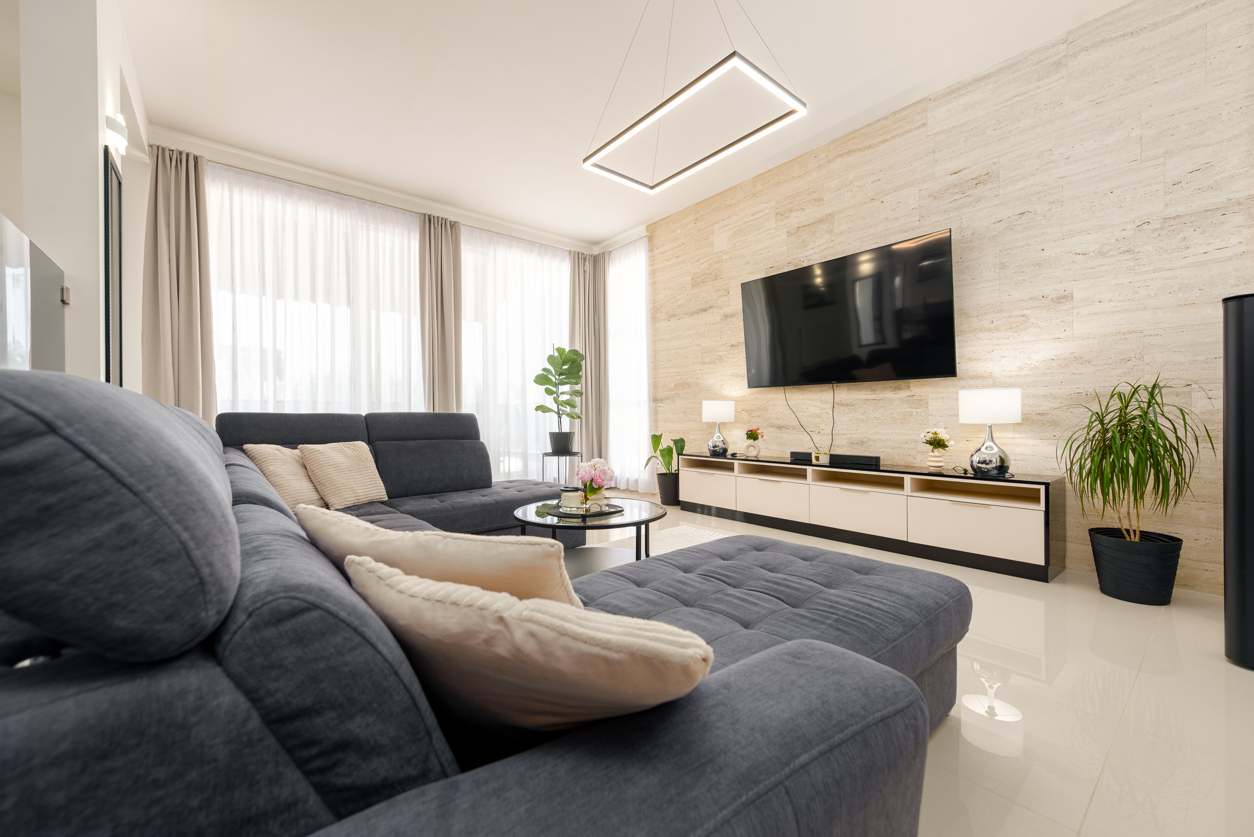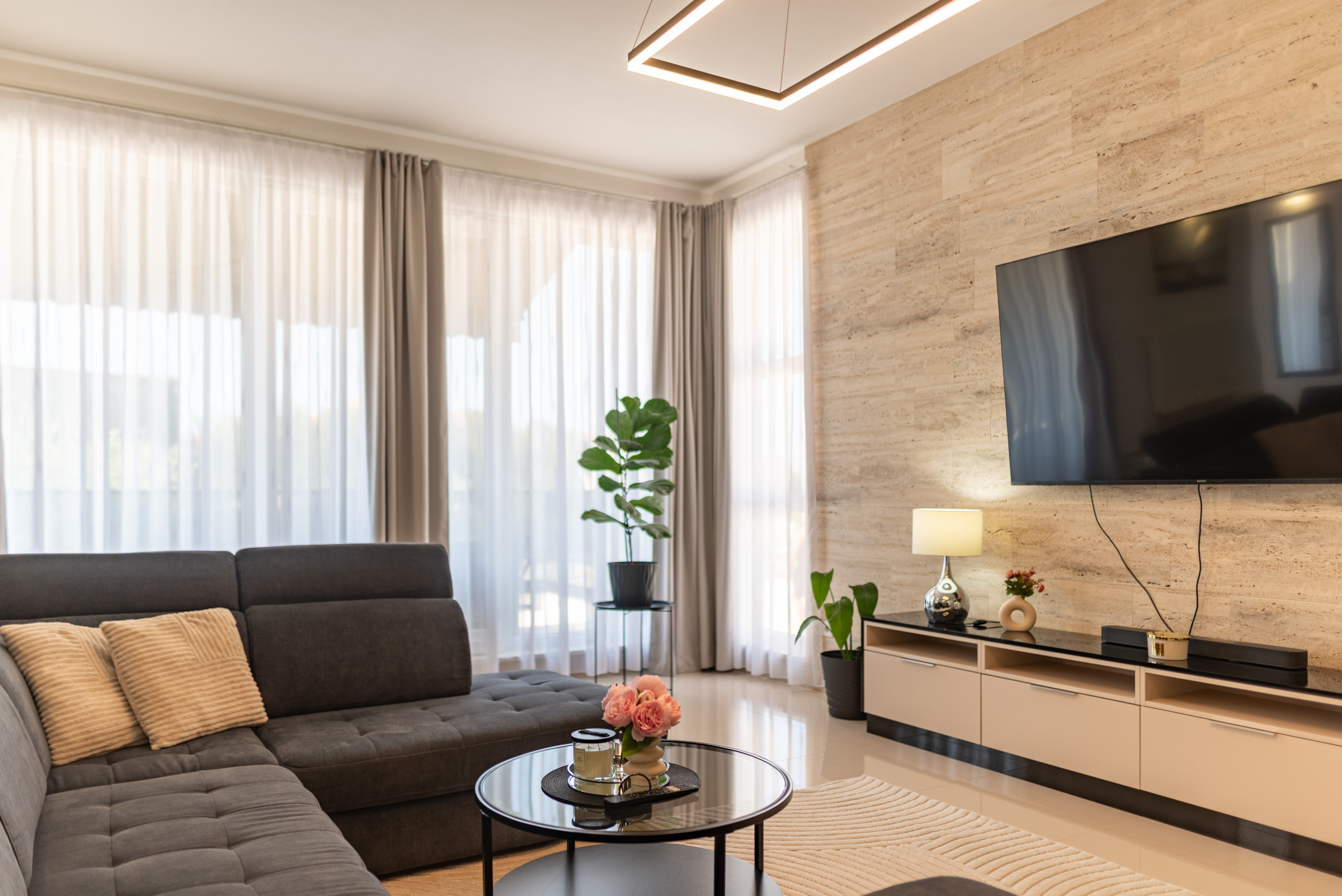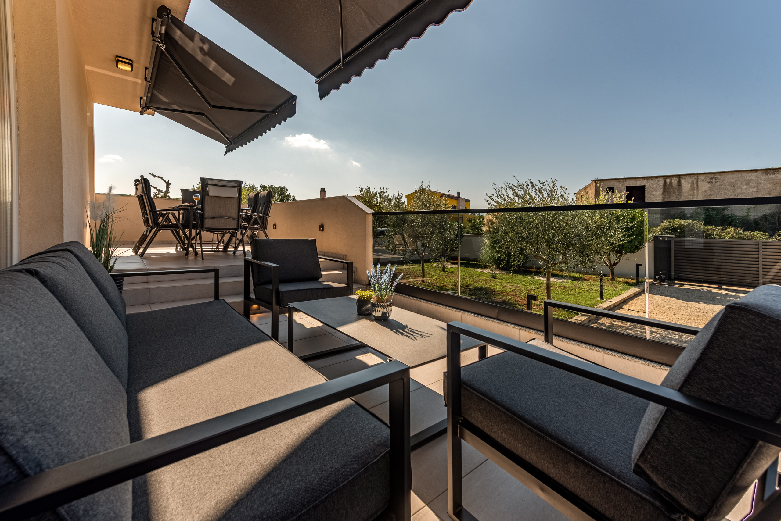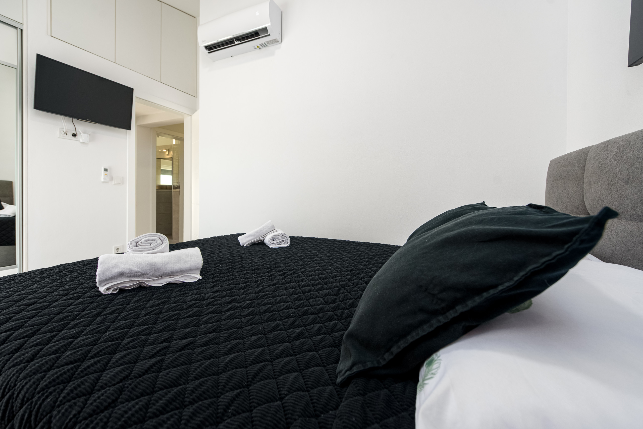 This modern and functionally designed villa accommodates up to six guests and offers three comfortable bedrooms, each with a double bed. Guests have access to two fully equipped bathrooms, as well as an elegant, modern kitchen that seamlessly blends into an open-plan space with a spacious and cozy living room – perfect for relaxation and socializing.