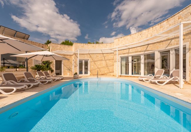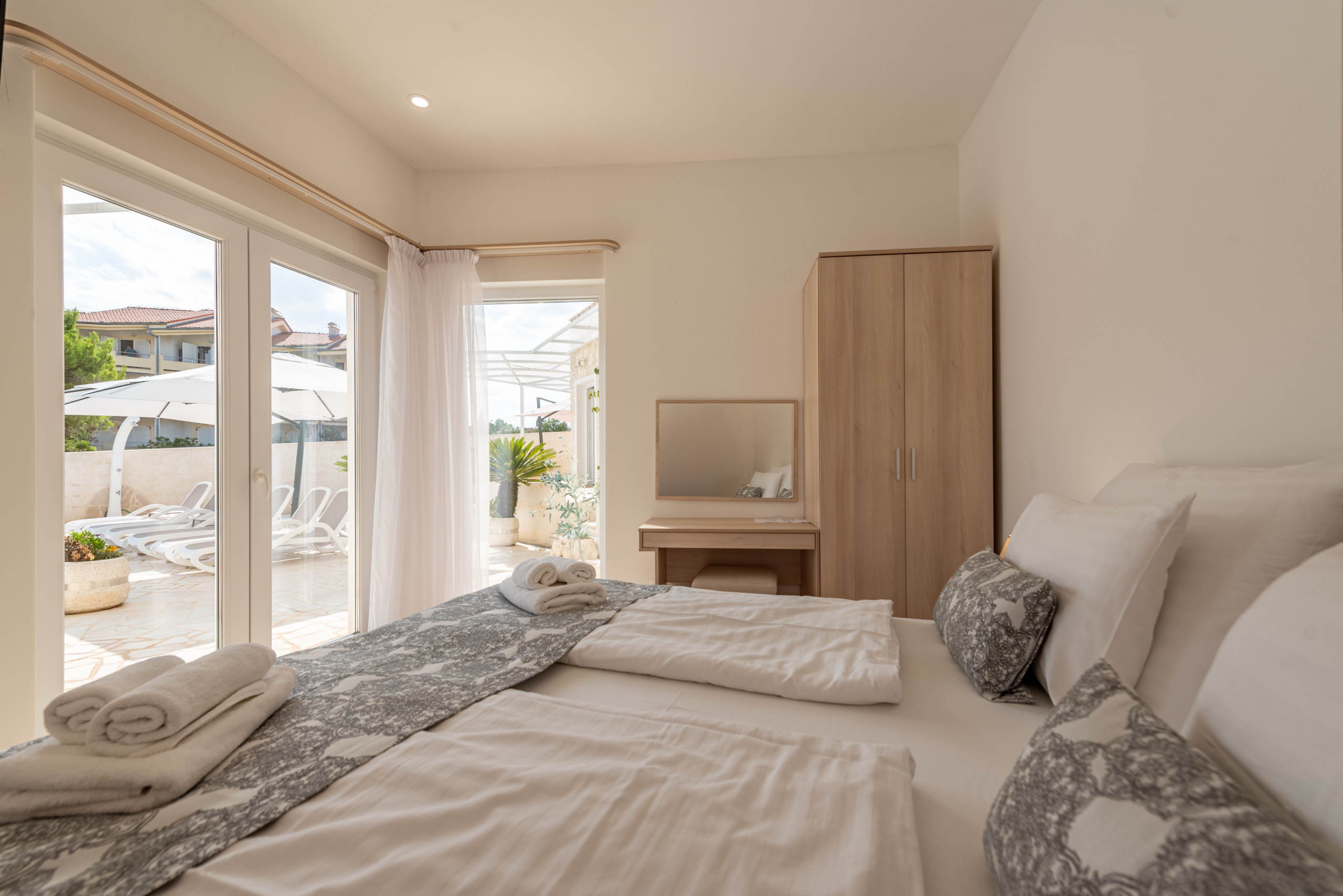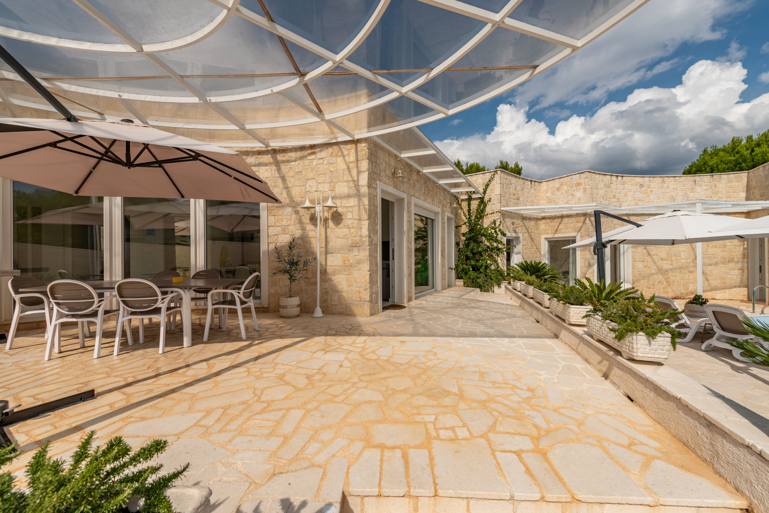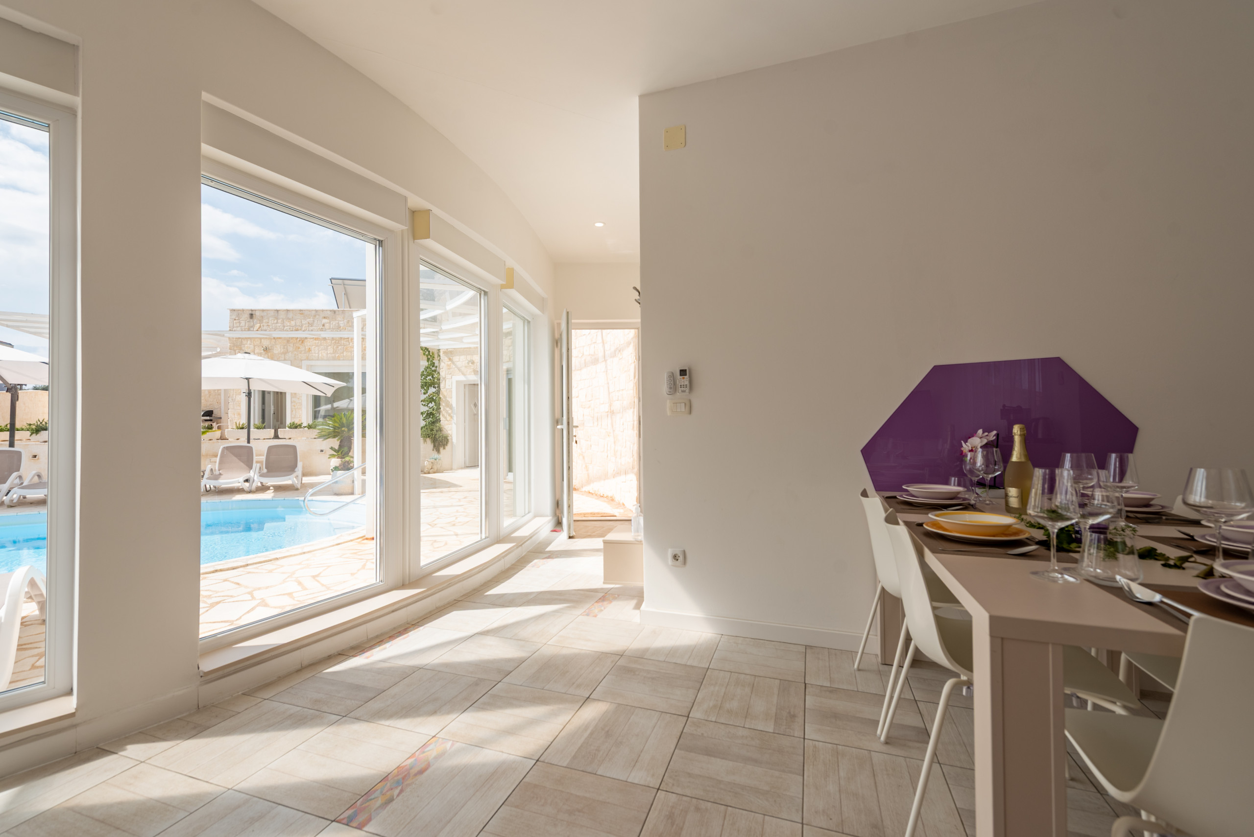 The interior of the villa is divided into two separate sections, with a pool as the central element. The spacious open-concept living room and kitchen create a comfortable gathering space, while four bedrooms are designed for maximum comfort, each with its own modernly equipped bathroom. Both sections of the villa feature a kitchen with a dining area and living room, as well as two en-suite bedrooms. One part of the villa is specially adapted for individuals with disabilities, allowing seamless wheelchair access. All rooms are air-conditioned, and underfloor heating in the bathrooms ensures a comfortable stay year-round. Between the two residential sections, there is a fully equipped office space that also serves as a reception area for welcoming guests—ideal for those who wish to combine relaxation with work obligations.