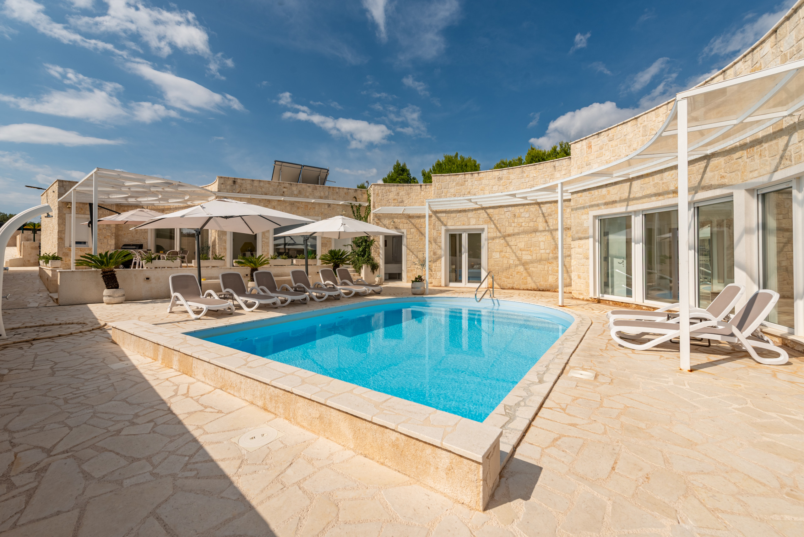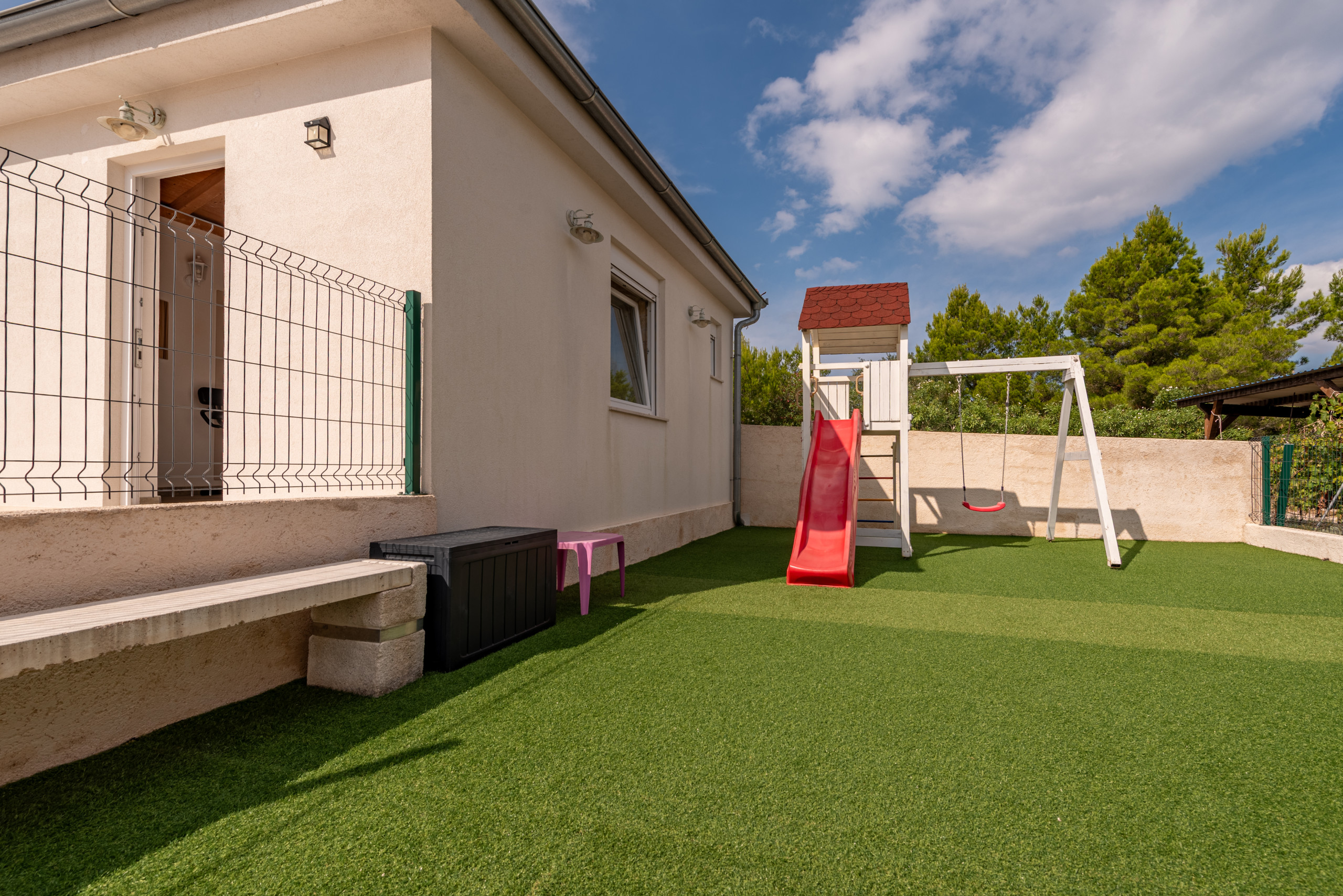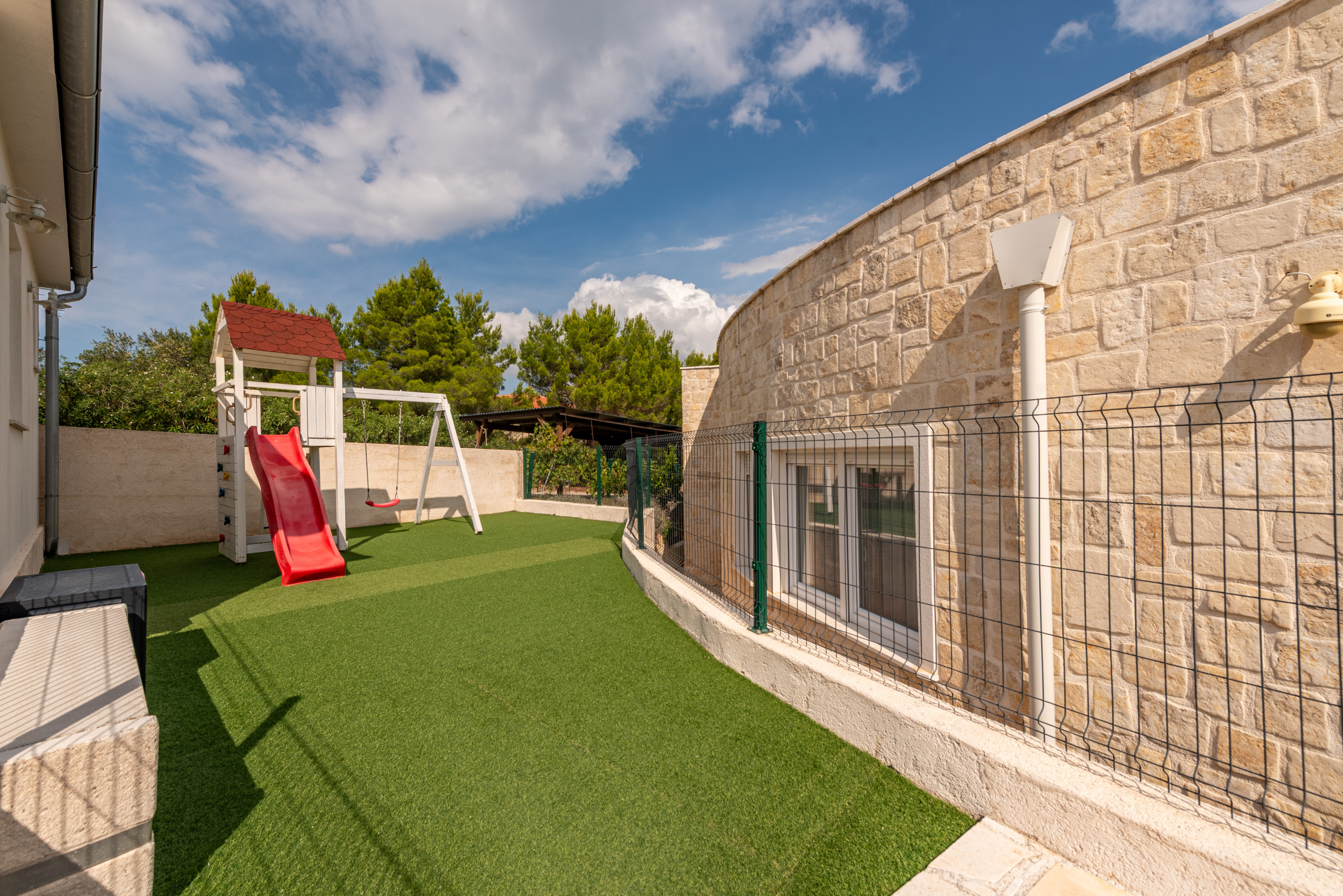 The villa’s outdoor space is just as impressive as its interior. The entire estate is fenced, and a beautiful Mediterranean garden filled with rosemary, lemons, oranges, and olives creates a peaceful and pleasant atmosphere. A pool with an outdoor shower invites relaxation, while a children's playground with a slide is located in the yard. Guests also have access to two bicycles for exploring the island.