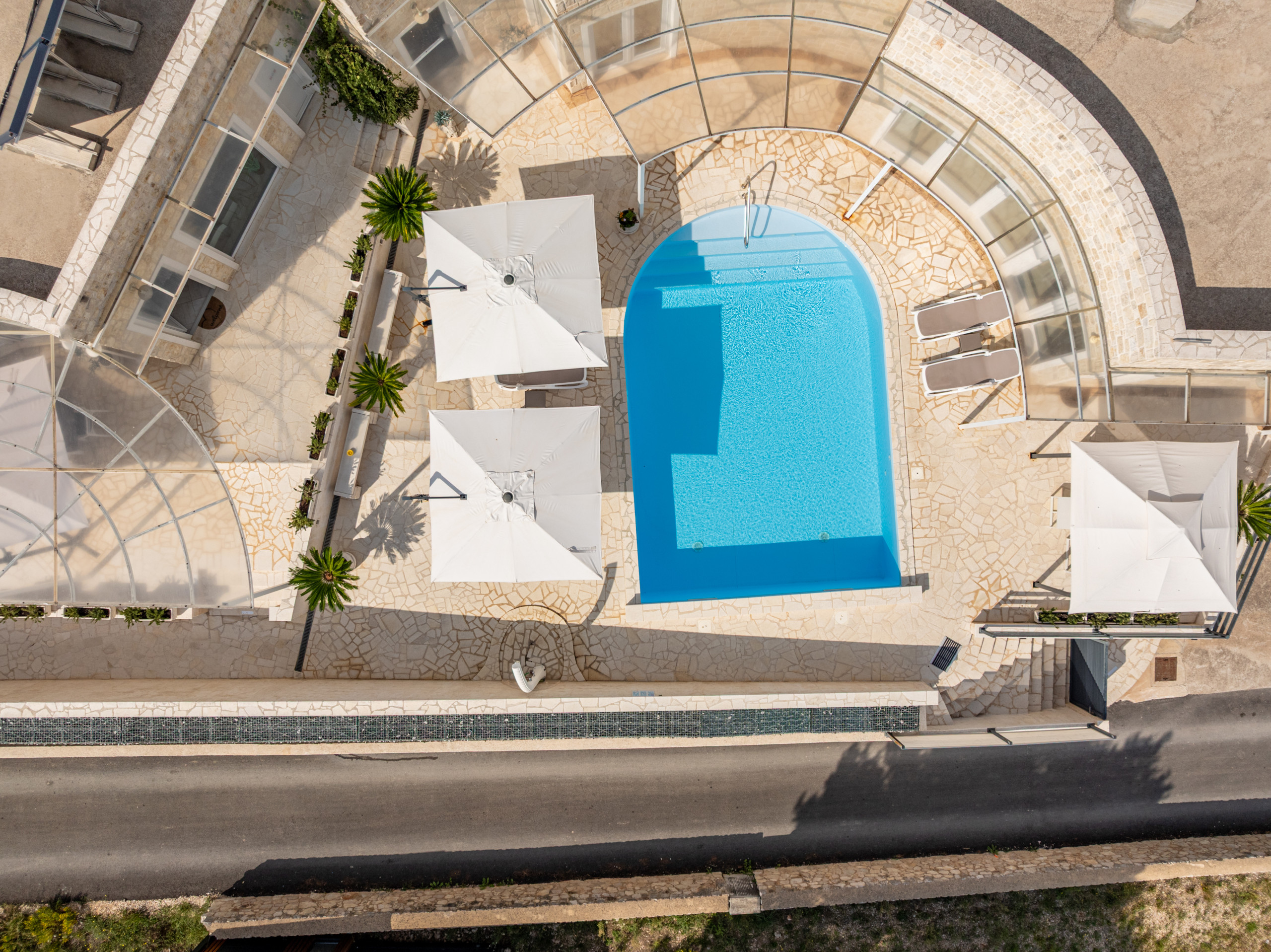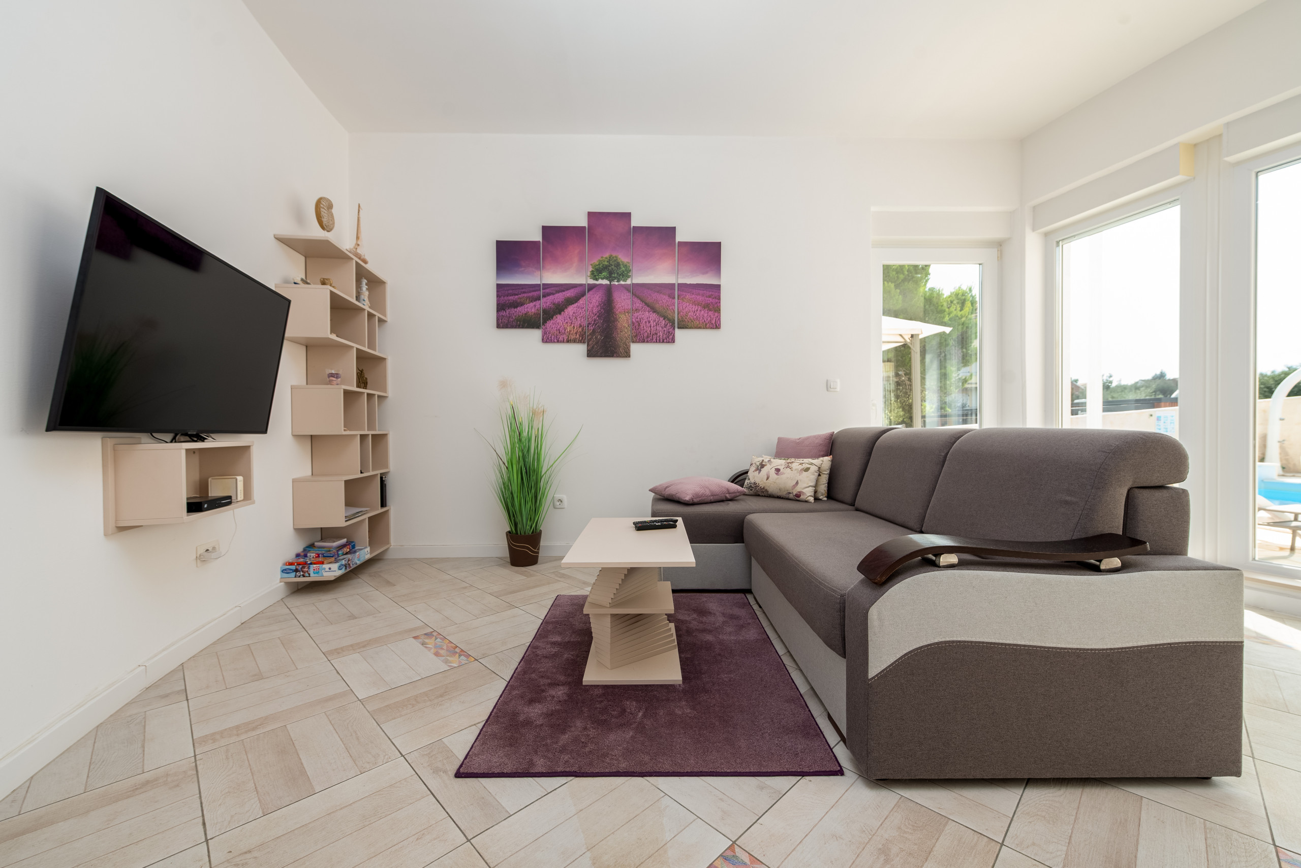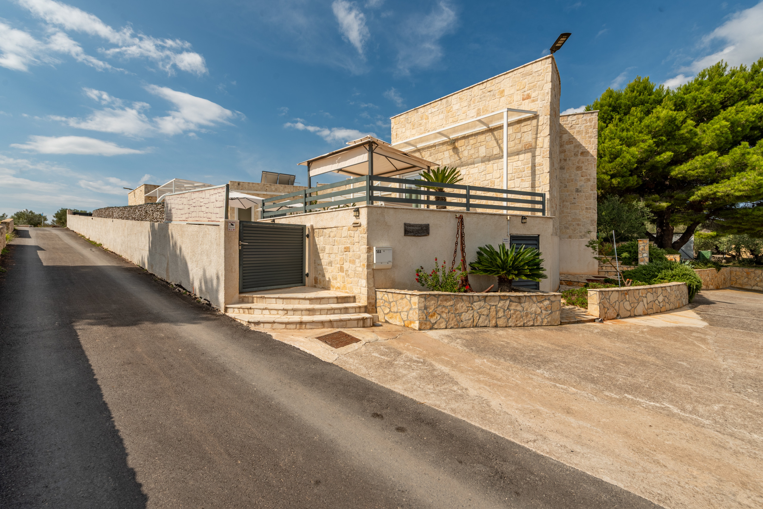 The villa’s outdoor space is just as impressive as its interior. The entire estate is fenced, and a beautiful Mediterranean garden filled with rosemary, lemons, oranges, and olives creates a peaceful and pleasant atmosphere. A pool with an outdoor shower invites relaxation, while a children's playground with a slide is located in the yard. Guests also have access to two bicycles for exploring the island.