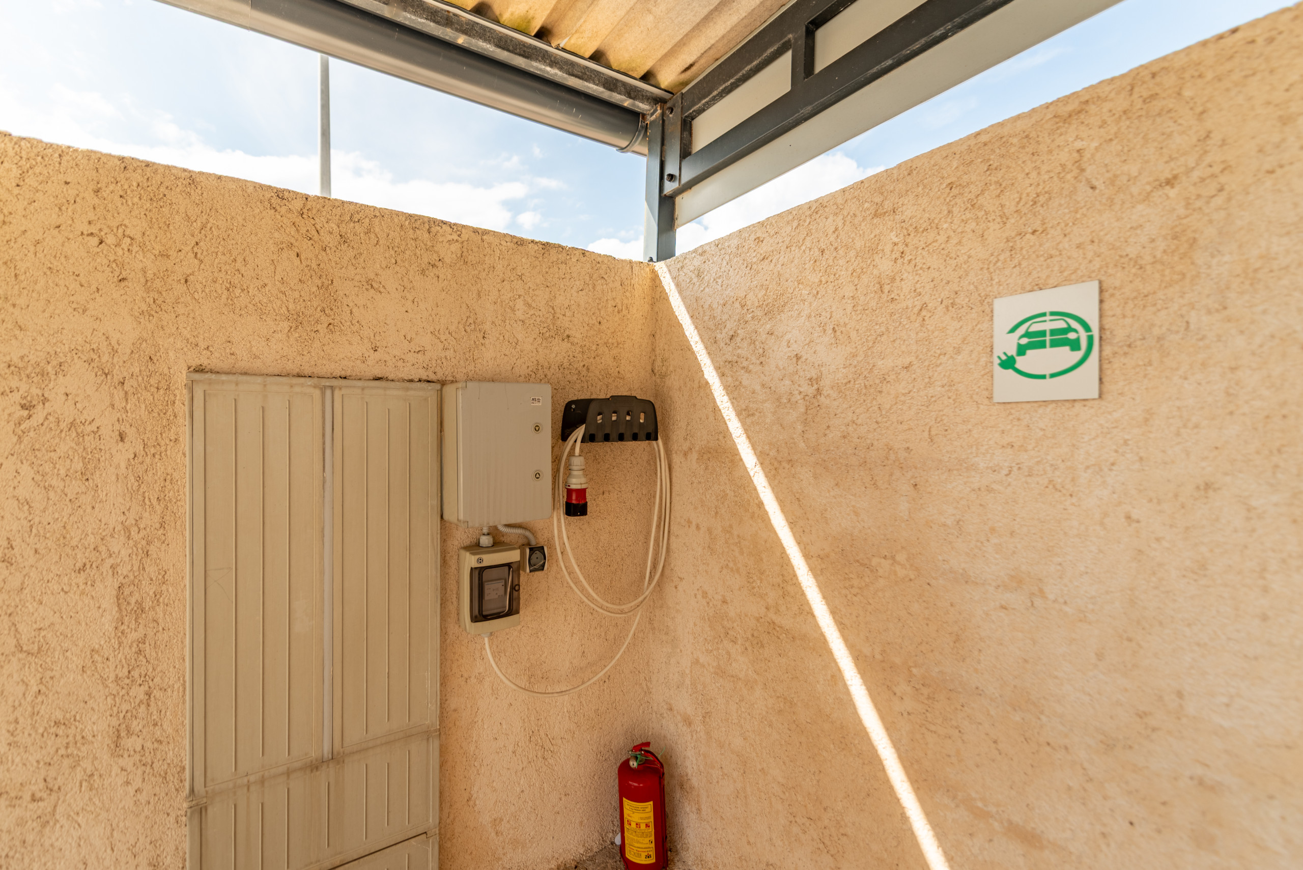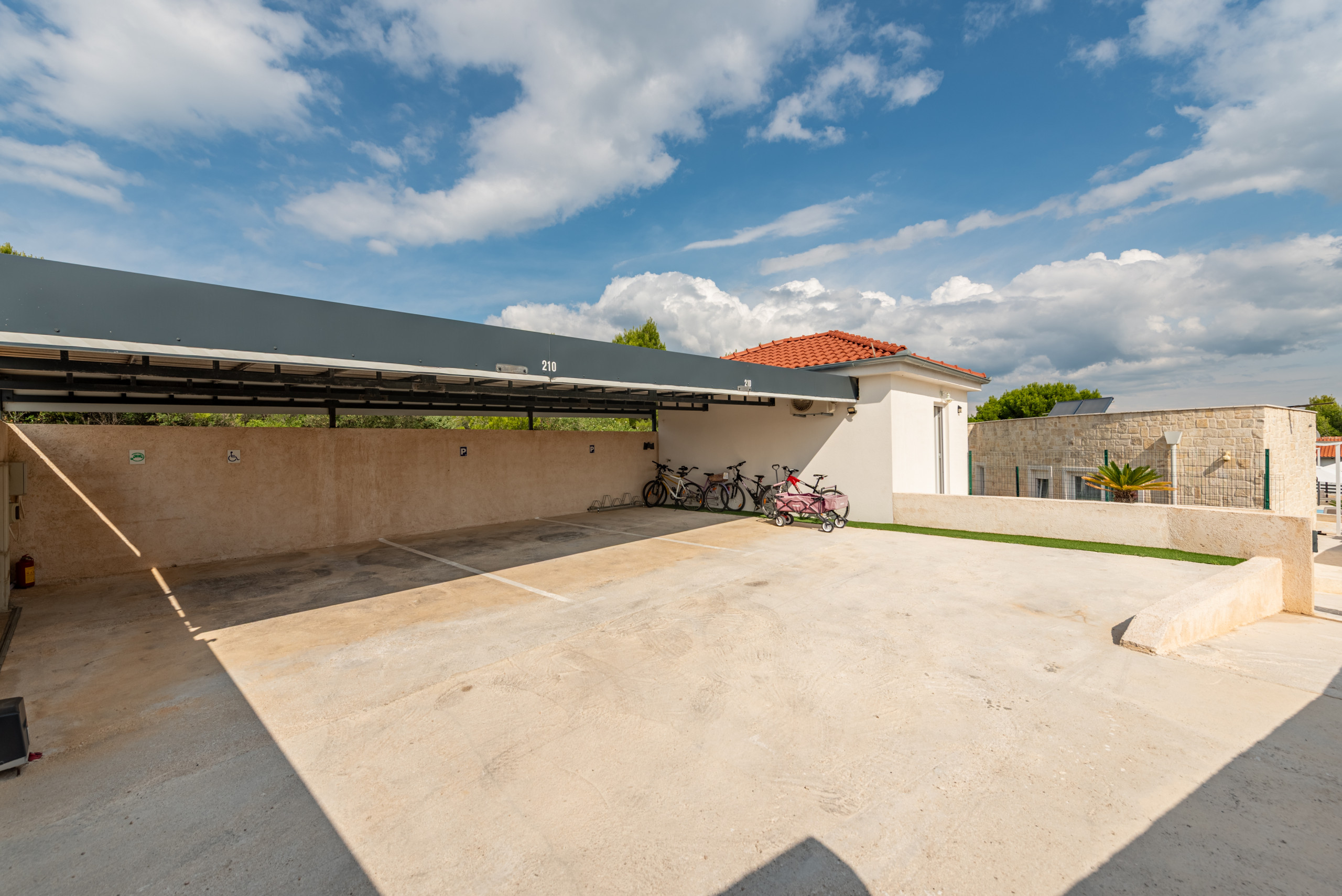 A covered parking area for three cars is provided, including an electric charging station.