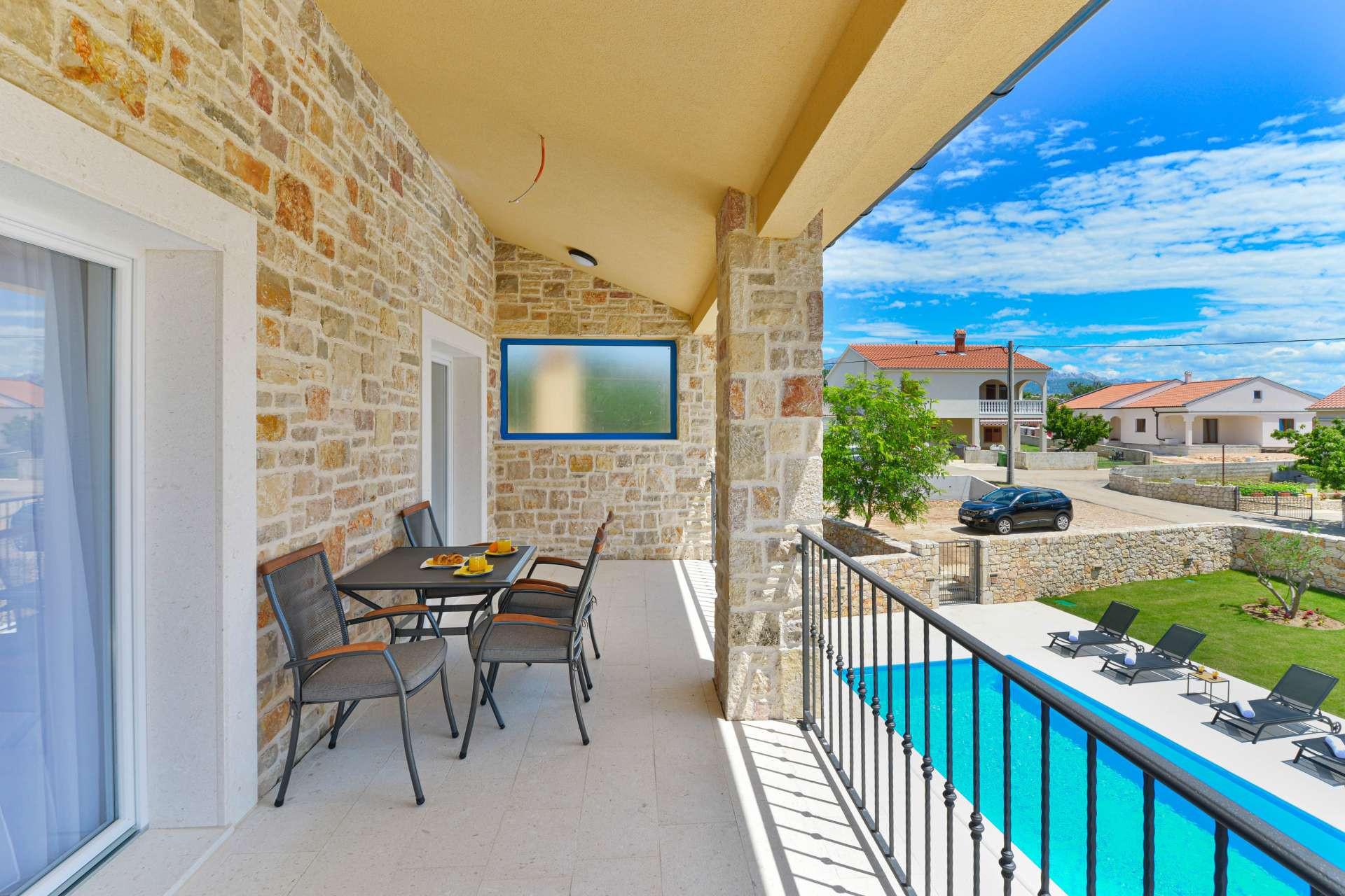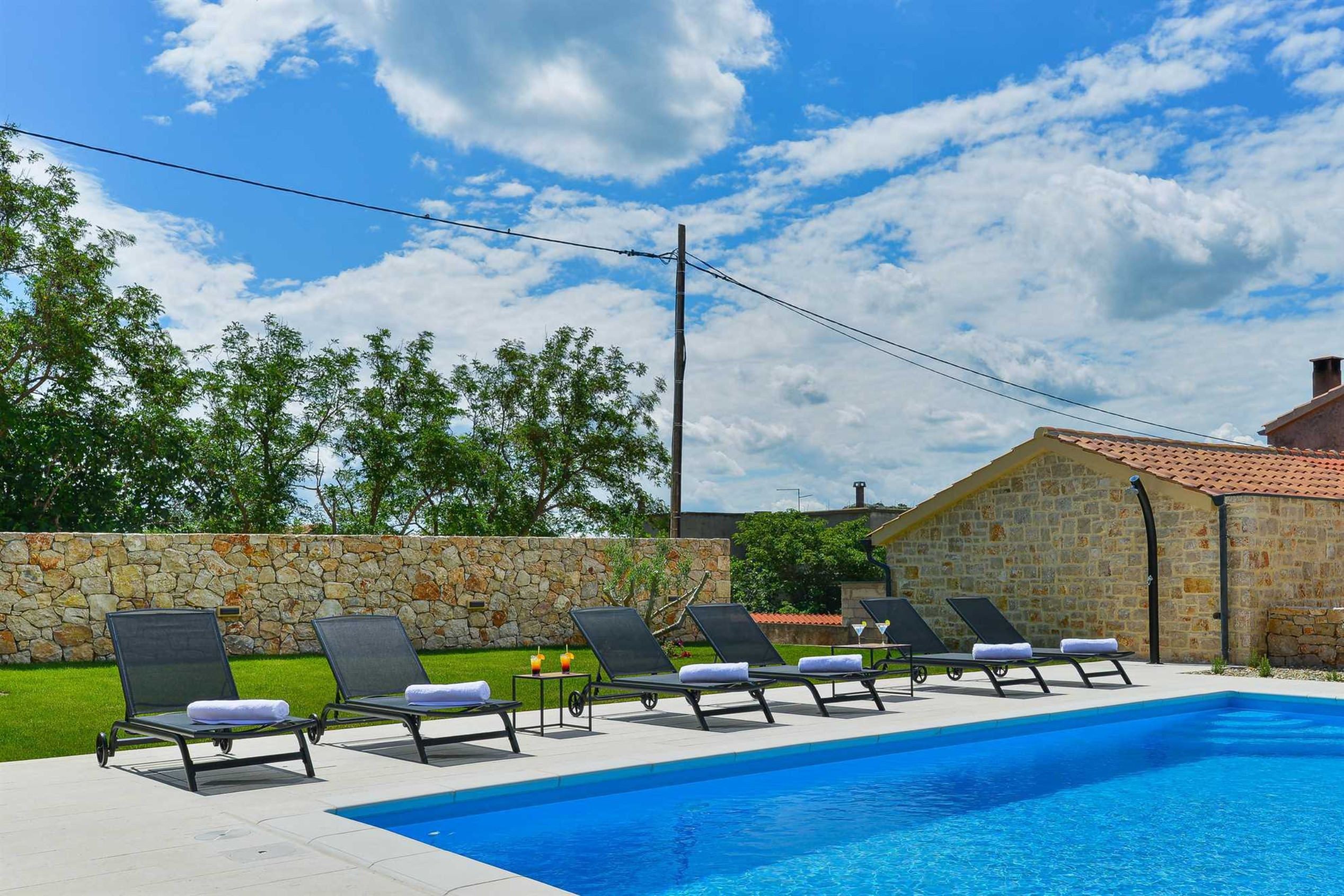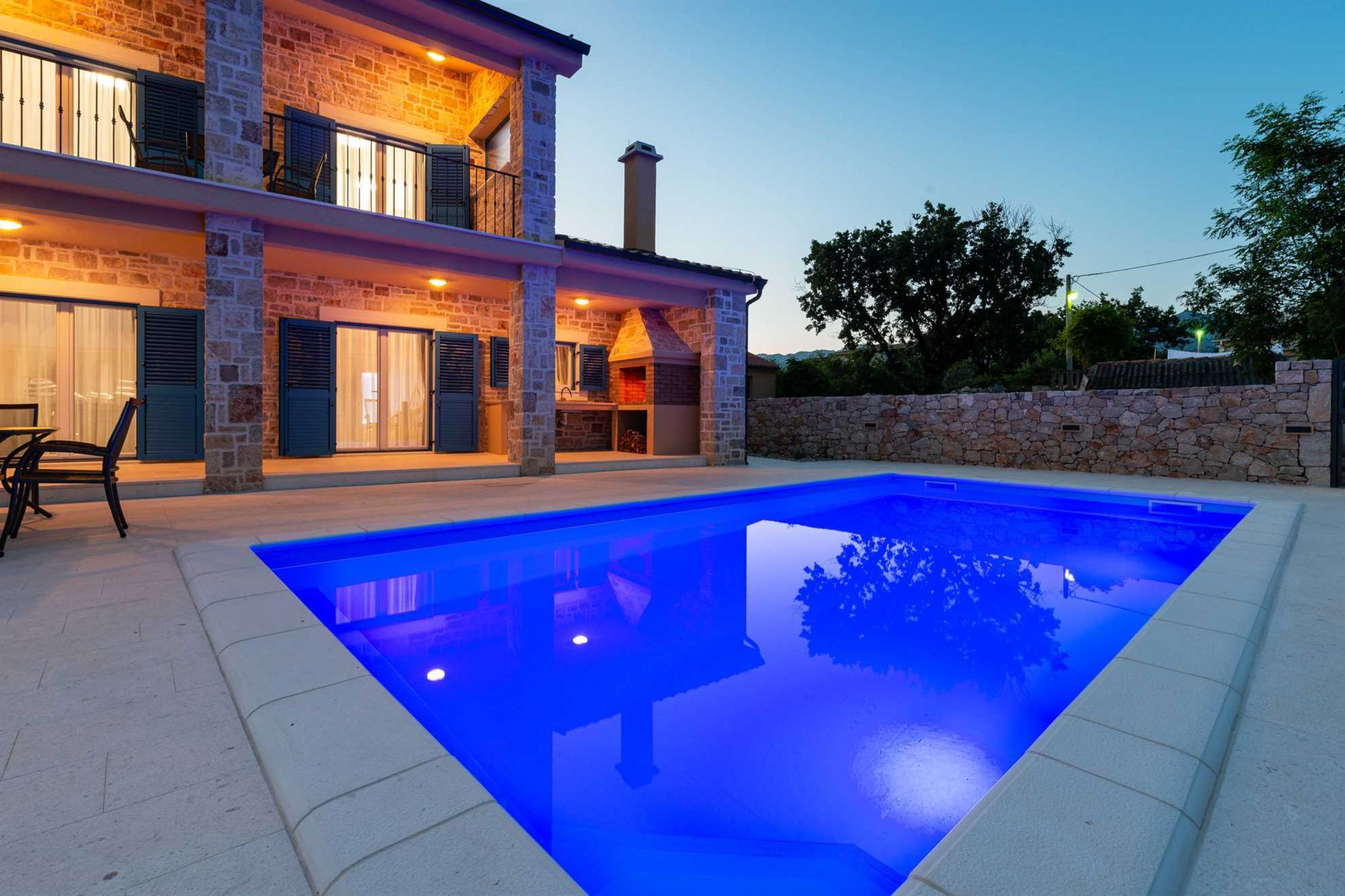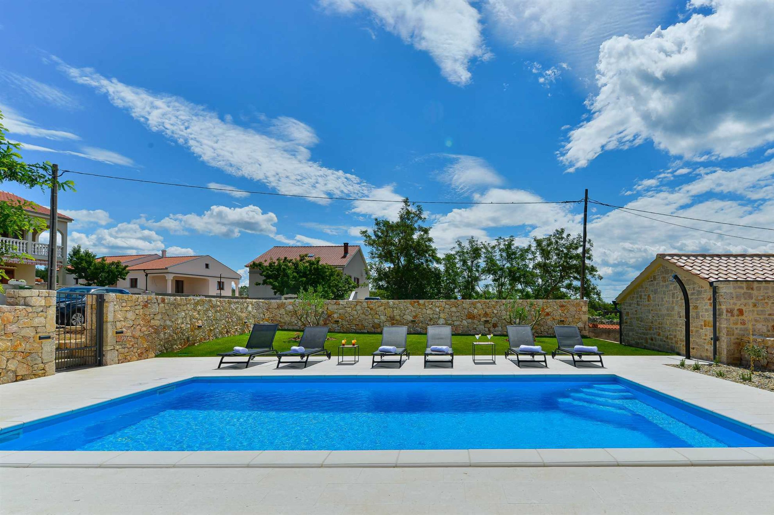 This stone, beautiful and brand new Villa is located in a small Dalmatian village Kneževići, near Vinjerac. Spacious The villa consists of three bedrooms with bathrooms. One bedroom is located on the ground floor and the other two on the first floor. Each room has a large double bed and a bathroom within the room.Two rooms on the first floor of the Villa share access to a beautiful terrace, which overlooks the garden with outdoor heated pool.On the ground floor, besides the bedroom, there is a modern living room with comfortable furniture, a fully equipped kitchen with new quality appliances and a large master bathroom that is adapted for people with disabilities.The ground floor of the Villa has access to a terrace with garden furniture, a summer kitchen with barbecue and a large outdoor heated pool with sun loungers and a shower.Use of the entire Villa is for guests only, and parking is free and secure. Ground floor of the villa is suitable for elderly and has wheelchair access.
